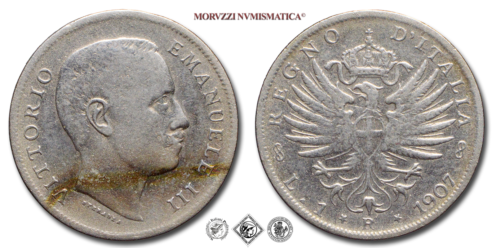 Emissione: 1907, Zecca di Roma, Rif. bibl. Pagani, 767; Metallo: AR, gr. 4,89, (MI159734), Diam.: mm. 23,24, MB