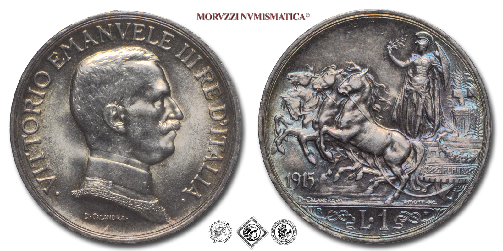 Regno d'Italia, VITTORIO EMANUELE III, 1900-12943, LIRA, Quadriga briosa, Emissione: 1915, D/ • VITTORIO • EMANUELE • III • RE • D'ITALIA •, busto in uniforme e con il collare dell'Annunziata del Re a d.; sotto: indicazione del nome dell'autore (D • CALANDRA •), R/ figura allegorica dell'Italia con scudo, elmo e ramo di quercia posta su di un carro trainato da quattro cavalli. Il carro è adorno di festoni, di nodi savoia e presenta il motto FERT; sotto le zampe anteriori dei cavalli: indicazione del millesimo (1915) ; in esergo: indicazione del nominale (L • 1) tra due nodi savoia; sopra il nodo di s.: il segno di zecca (R); sopra il nodo di d.: una stella a cinque punte; sulla linea dell'esergo: a s. il nome dell'autore (D • CALANDRA • M), a d. il nome dell'incisore (A • MOTTI INC •), Zecca di Roma, Rif. bibl. Pagani, 773; Metallo: AR, gr. 5,01, (MI116816), Diam.: mm. 23,21, qFDC