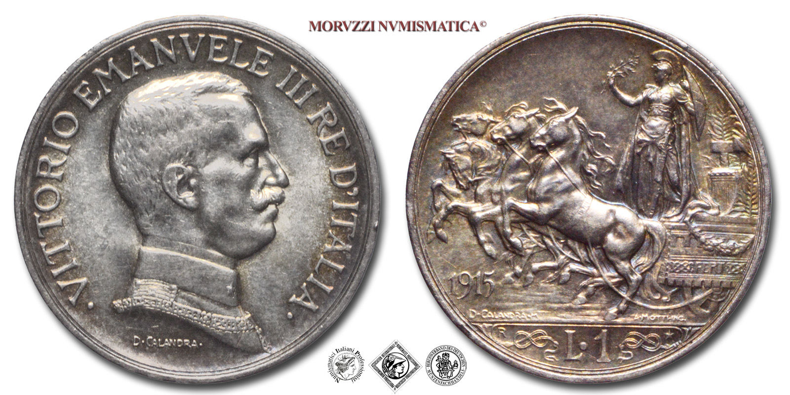 Regno d'Italia, VITTORIO EMANUELE III, 1900-12943, LIRA, Quadriga briosa, Emissione: 1915, D/ • VITTORIO • EMANUELE • III • RE • D'ITALIA •, busto in uniforme e con il collare dell'Annunziata del Re a d.; sotto: indicazione del nome dell'autore (D • CALANDRA •), R/ figura allegorica dell'Italia con scudo, elmo e ramo di quercia posta su di un carro trainato da quattro cavalli. Il carro è adorno di festoni, di nodi savoia e presenta il motto FERT; sotto le zampe anteriori dei cavalli: indicazione del millesimo (1915) ; in esergo: indicazione del nominale (L • 1) tra due nodi savoia; sopra il nodo di s.: il segno di zecca (R); sopra il nodo di d.: una stella a cinque punte; sulla linea dell'esergo: a s. il nome dell'autore (D • CALANDRA • M), a d. il nome dell'incisore (A • MOTTI INC •), Zecca di Roma, Rif. bibl. Pagani, 773; Metallo: AR, gr. 5,01, (MI116818), Diam.: mm. 23,20, qFDC