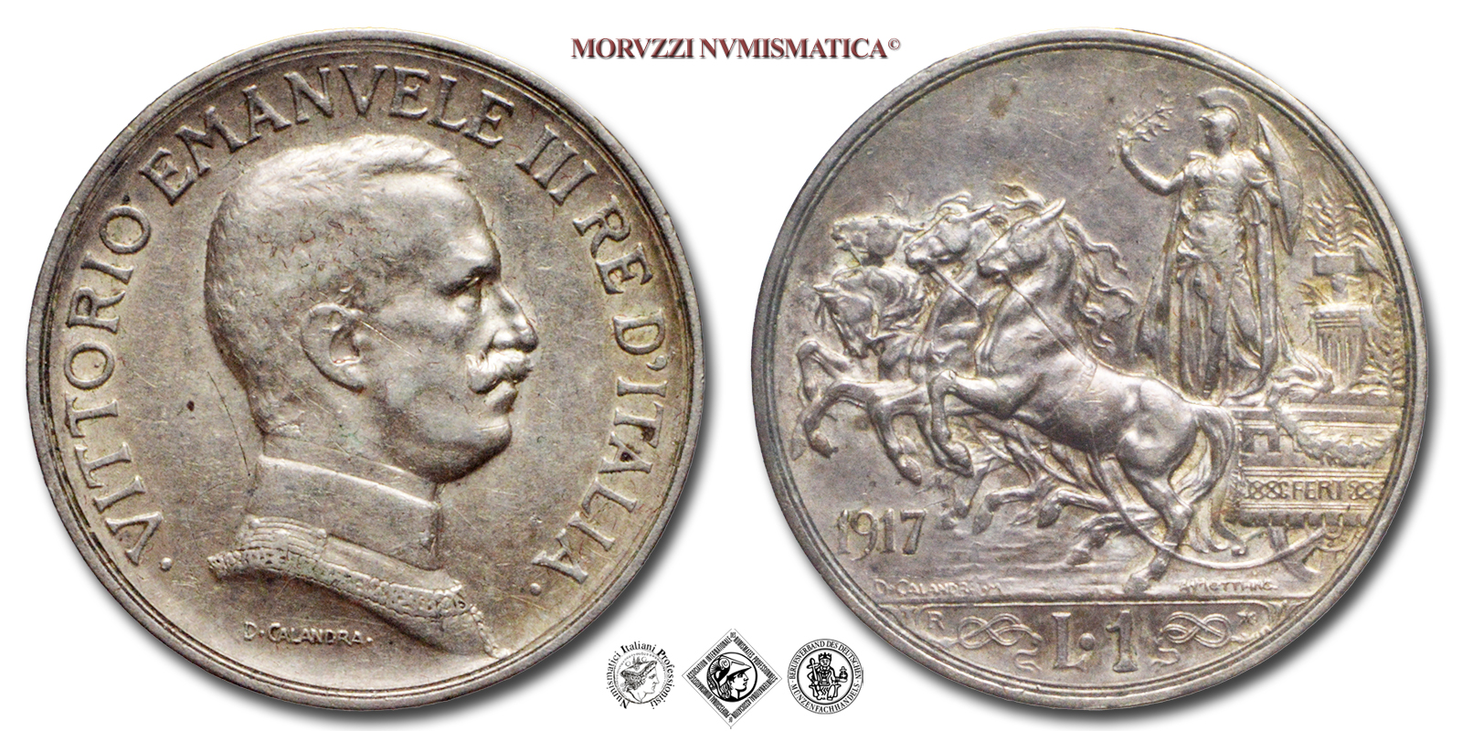 Regno d'Italia, VITTORIO EMANUELE III, 1900-12943, LIRA, Quadriga briosa, Emissione: 1917, D/ • VITTORIO • EMANUELE • III • RE • D'ITALIA •, busto in uniforme e con il collare dell'Annunziata del Re a d.; sotto: indicazione del nome dell'autore (D • CALANDRA •), R/ figura allegorica dell'Italia con scudo, elmo e ramo di quercia posta su di un carro trainato da quattro cavalli. Il carro è adorno di festoni, di nodi savoia e presenta il motto FERT; sotto le zampe anteriori dei cavalli: indicazione del millesimo (1917) ; in esergo: indicazione del nominale (L • 1) tra due nodi savoia; sopra il nodo di s.: il segno di zecca (R); sopra il nodo di d.: una stella a cinque punte; sulla linea dell'esergo: a s. il nome dell'autore (D • CALANDRA • M), a d. il nome dell'incisore (A • MOTTI INC •), Zecca di Roma, Rif. bibl. Pagani, 775; Metallo: AR, gr. 5,01, (MI153159), Diam.: mm. 23,15, mBB