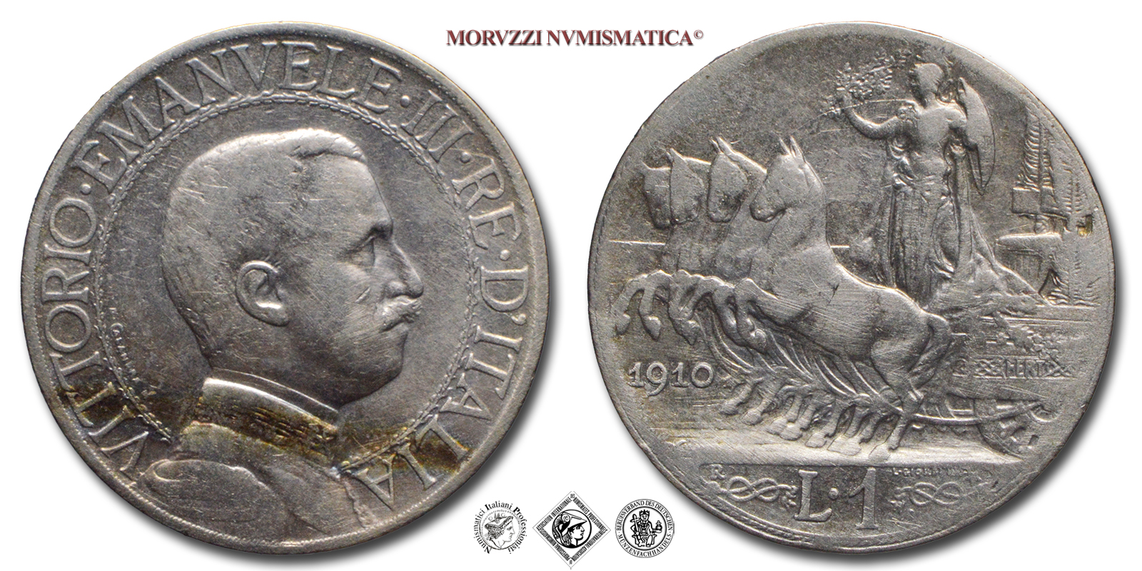 Regno d'Italia, VITTORIO EMANUELE III, 1900-1943, LIRA, Quadriga veloce, Emissione: 1910, D/ semibusto in uniforme del Re volto a destra, contornato da: VITTORIO • EMANUELE • III • RE • D'ITALIA cerchiato. A ore 8 fra il colletto dell'uniforme e il cerchio interno il nome dell'autore D • CALANDRA M •, R/ figura allegorica dell'Italia con scudo, elmo e ramo di quercia posta su di un carro trainato da quattro cavalli. Il carro è adornato di nodi savoia. Sotto le zampe dei cavalli l'indicazione del millesimo (1910). In esergo il valore (L • 1) tra due nodi savoia, sopra il nodo di sinistra il segno di zecca (R), sopra il nodo di destra il nome dell'incisore: D • GIORGI INC. e una stella a cinque punte. A ore sette sulla linea dell'esergo: D • CALANDRA M •, Zecca di Roma, Rif. bibl. Pagani, 770; Metallo: AR, gr. 4,97, (MI159733), Diam.: mm. 23,25, mB