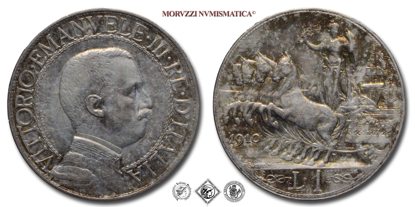 Regno d'Italia, VITTORIO EMANUELE III, 1900-1943, LIRA, Quadriga veloce, Emissione: 1910, D/ semibusto in uniforme del Re volto a destra, contornato da: VITTORIO • EMANUELE • III • RE • D'ITALIA cerchiato. A ore 8 fra il colletto dell'uniforme e il cerchio interno il nome dell'autore D • CALANDRA M •, R/ figura allegorica dell'Italia con scudo, elmo e ramo di quercia posta su di un carro trainato da quattro cavalli. Il carro è adornato di nodi savoia. Sotto le zampe dei cavalli l'indicazione del millesimo (1910). In esergo il valore (L • 1) tra due nodi savoia, sopra il nodo di sinistra il segno di zecca (R), sopra il nodo di destra il nome dell'incisore: D • GIORGI INC. e una stella a cinque punte. A ore sette sulla linea dell'esergo: D • CALANDRA M •, Zecca di Roma, Rif. bibl. Pagani, 770; Metallo: AR, gr. 5,03, (MI116831), Diam.: mm. 23,21, mBB