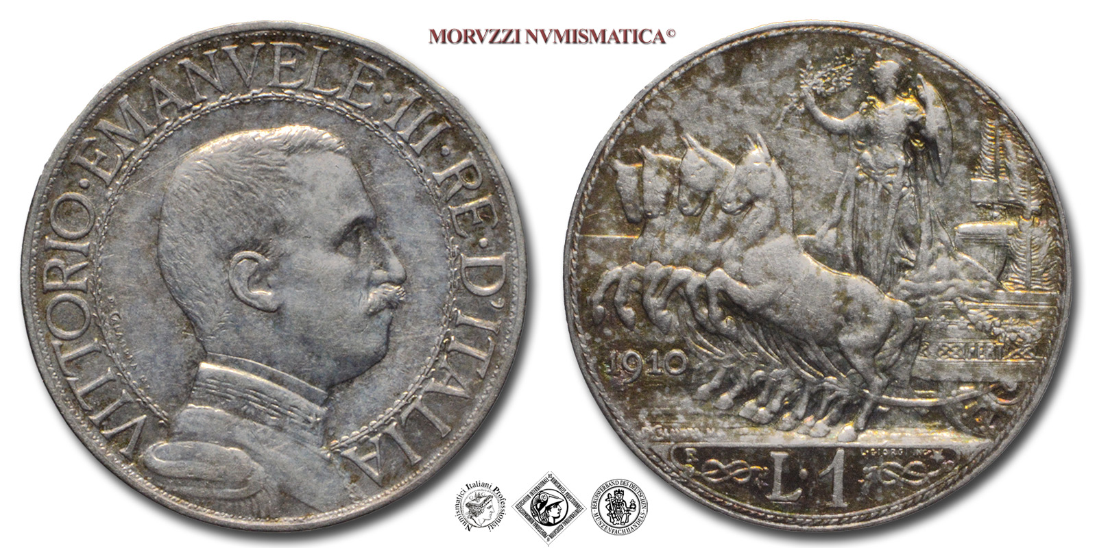 Regno d'Italia, VITTORIO EMANUELE III, 1900-1943, LIRA, Quadriga veloce, Emissione: 1910, D/ semibusto in uniforme del Re volto a destra, contornato da: VITTORIO • EMANUELE • III • RE • D'ITALIA cerchiato. A ore 8 fra il colletto dell'uniforme e il cerchio interno il nome dell'autore D • CALANDRA M •, R/ figura allegorica dell'Italia con scudo, elmo e ramo di quercia posta su di un carro trainato da quattro cavalli. Il carro è adornato di nodi savoia. Sotto le zampe dei cavalli l'indicazione del millesimo (1910). In esergo il valore (L • 1) tra due nodi savoia, sopra il nodo di sinistra il segno di zecca (R), sopra il nodo di destra il nome dell'incisore: D • GIORGI INC. e una stella a cinque punte. A ore sette sulla linea dell'esergo: D • CALANDRA M •, Zecca di Roma, Rif. bibl. Pagani, 770; Metallo: AR, gr. 5,02, (MI116829), Diam.: mm. 23,24, mBB