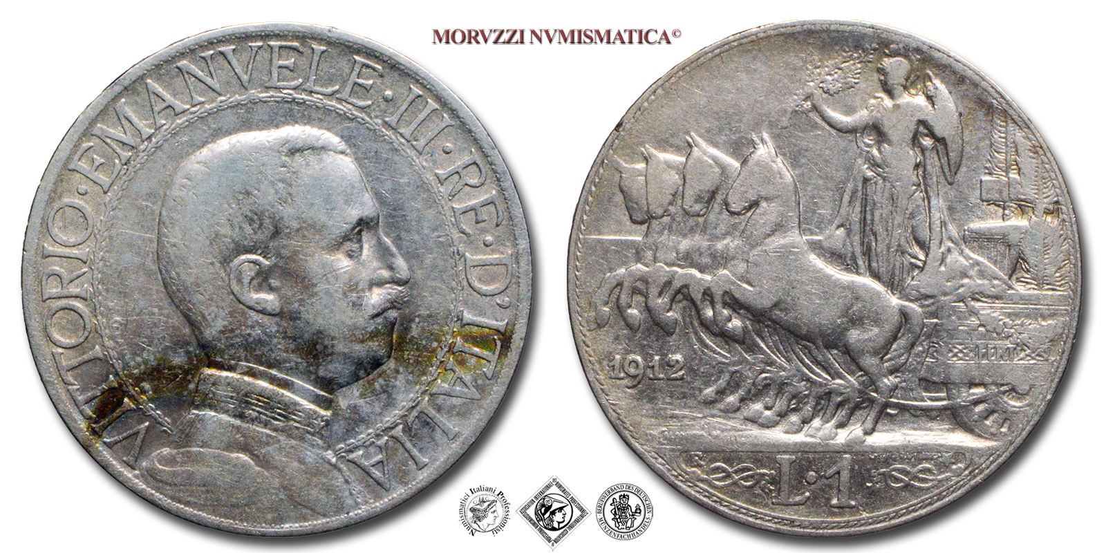 Regno d'Italia, VITTORIO EMANUELE III, 1900-1943, LIRA, Quadriga veloce, Emissione: 1912, D/ semibusto in uniforme del Re volto a destra, contornato da: VITTORIO • EMANUELE • III • RE • D'ITALIA cerchiato. A ore 8 fra il colletto dell'uniforme e il cerchio interno il nome dell'autore D • CALANDRA M •, R/ figura allegorica dell'Italia con scudo, elmo e ramo di quercia posta su di un carro trainato da quattro cavalli. Il carro è adornato di nodi savoia. Sotto le zampe dei cavalli l'indicazione del millesimo (1912). In esergo il valore (L • 1) tra due nodi savoia, sopra il nodo di sinistra il segno di zecca (R), sopra il nodo di destra il nome dell'incisore: D • GIORGI INC. e una stella a cinque punte. A ore sette sulla linea dell'esergo: D • CALANDRA M •, Zecca di Roma, Rif. bibl. Pagani, 771; Metallo: AR, gr. 4,87, (MI159731), Diam.: mm. 23,30, BB