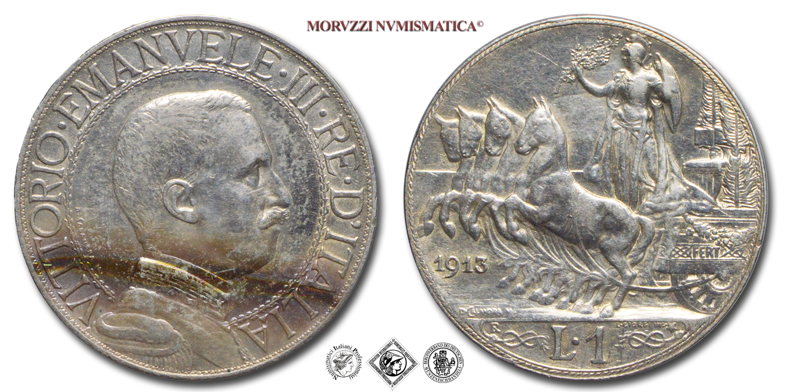 Regno d'Italia, VITTORIO EMANUELE III, 1900-1943, LIRA, Quadriga veloce, Emissione: 1913, D/ semibusto in uniforme del Re volto a destra, contornato da: VITTORIO • EMANUELE • III • RE • D'ITALIA cerchiato. A ore 8 fra il colletto dell'uniforme e il cerchio interno il nome dell'autore D • CALANDRA M •, R/ figura allegorica dell'Italia con scudo, elmo e ramo di quercia posta su di un carro trainato da quattro cavalli. Il carro è adornato di nodi savoia. Sotto le zampe dei cavalli l'indicazione del millesimo (1913). In esergo il valore (L • 1) tra due nodi savoia, sopra il nodo di sinistra il segno di zecca (R), sopra il nodo di destra il nome dell'incisore: D • GIORGI INC. e una stella a cinque punte. A ore sette sulla linea dell'esergo: D • CALANDRA M •, Zecca di Roma, Rif. bibl. Pagani, 772; Metallo: AR, gr. 5,01, (MI159730), Diam.: mm. 23,14, mBB