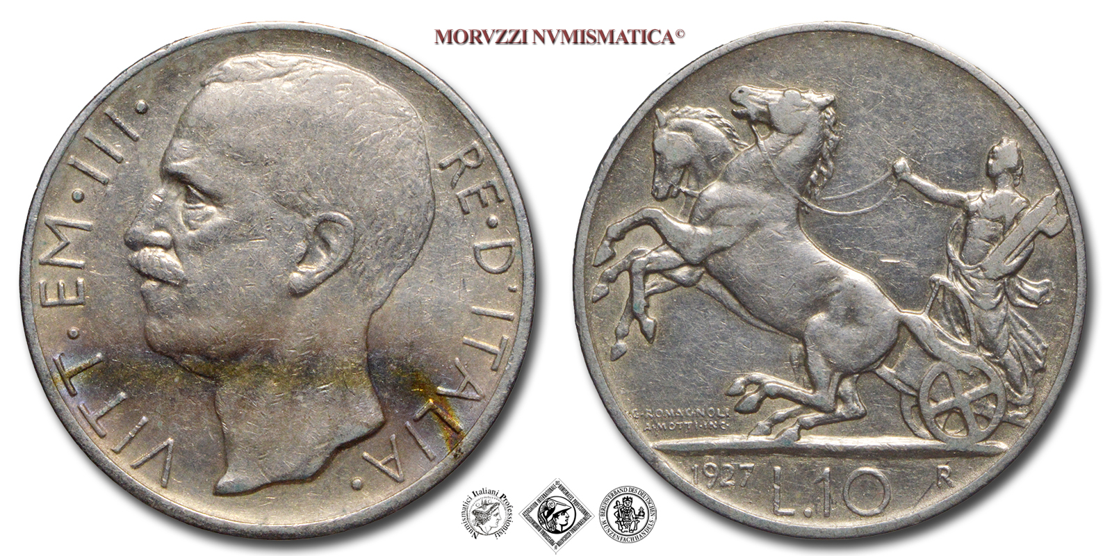 Regno d'Italia, VITTORIO EMANUELE III, 1900-1943, LIRE 10, Biga - due rosette, Emissione: 1927, D/ VITT • EM • III • RE • D'ITALIA •, testa nuda del Re a sinistra, R/ figura allegorica dell'Italia volta a s., su biga, nella mano sinistra stringe un fascio littorio e con la destra le redini; Sotto ai cavalli i nomi dell'incisore (MOTTI INC •) e dell'autore (G • ROMAGNOLI). In esergo il valore (L • 10) tra la data (1927) e il segno di zecca (R), Zecca di Roma, Rif. bibl. Pagani, 692a; Metallo: AR, 9,89, (MI159728), Diam.: mm. 27,22, BB