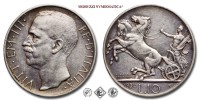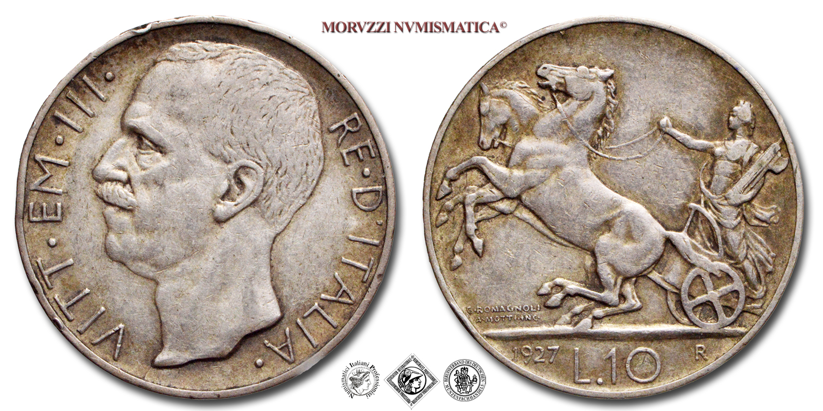 Regno d'Italia, VITTORIO EMANUELE III, 1900-1943, LIRE 10, Biga - due rosette, Emissione: 1927, D/ VITT • EM • III • RE • D'ITALIA •, testa nuda del Re a sinistra, R/ figura allegorica dell'Italia volta a s., su biga, nella mano sinistra stringe un fascio littorio e con la destra le redini; Sotto ai cavalli i nomi dell'incisore (MOTTI INC •) e dell'autore (G • ROMAGNOLI). In esergo il valore (L • 10) tra la data (1927) e il segno di zecca (R), Zecca di Roma, Rif. bibl. Pagani, 692a; Metallo: AR, 9,94, (MI63774), Diam.: mm. 27,05, MB