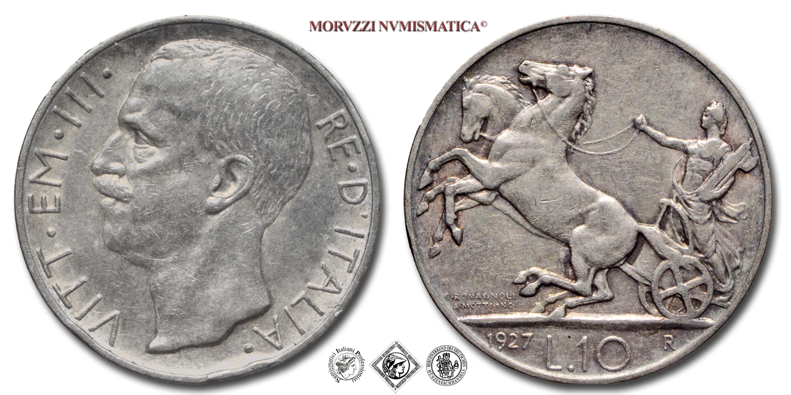 Regno d'Italia, VITTORIO EMANUELE III, 1900-1943, LIRE 10, Biga - due rosette, Emissione: 1927, D/ VITT • EM • III • RE • D'ITALIA •, testa nuda del Re a sinistra, R/ figura allegorica dell'Italia volta a s., su biga, nella mano sinistra stringe un fascio littorio e con la destra le redini; Sotto ai cavalli i nomi dell'incisore (MOTTI INC •) e dell'autore (G • ROMAGNOLI). In esergo il valore (L • 10) tra la data (1927) e il segno di zecca (R), Zecca di Roma, Rif. bibl. Pagani, 692a; Metallo: AR, 9,99, (MI59991), Diam.: mm. 27,01, MB