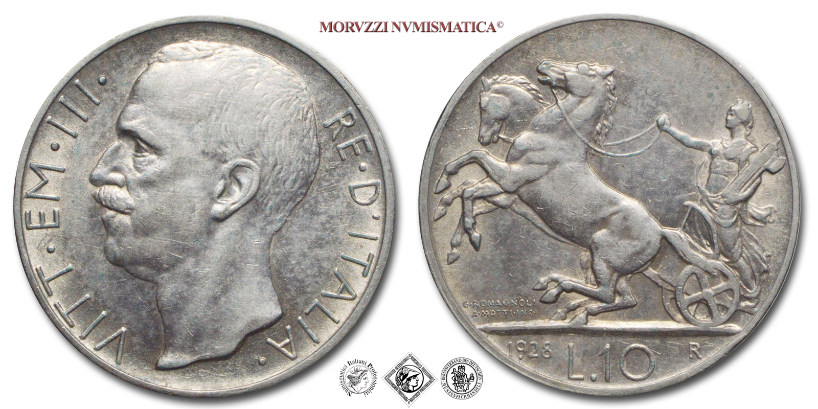 Regno d'Italia, VITTORIO EMANUELE III, 1900-1943, LIRE 10, Biga - una rosetta, Emissione: 1928, D/ VITT • EM • III • RE • D'ITALIA •, testa nuda del Re a sinistra, R/ figura allegorica dell'Italia volta a s., su biga, nella mano sinistra stringe un fascio littorio e con la destra le redini; Sotto ai cavalli i nomi dell'incisore (MOTTI INC •) e dell'autore (G • ROMAGNOLI). In esergo il valore (L • 10) tra la data (1928) e il segno di zecca (R), Zecca di Roma, Rif. bibl. Pagani, 693; Metallo: AR, gr. 10,03, (MI74811), Diam.: mm. 27,11, mBB, (NC)
