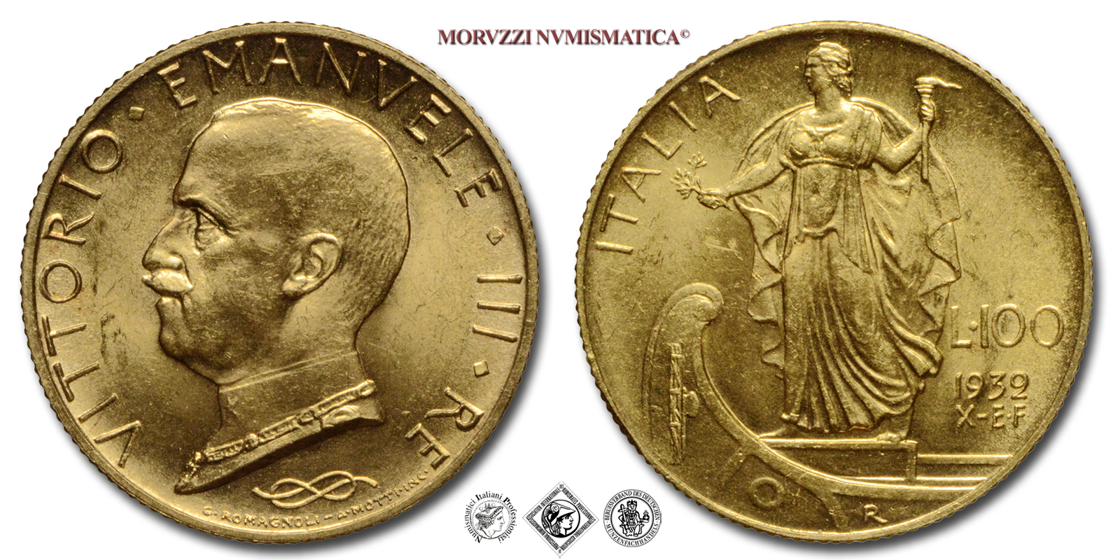 Regno d'Italia, VITTORIO EMANUELE III, 1900-1943, LIRE 100, Italia su prora, Emissione: 1932 A X, D/ VITTORIO • EMANUELE • III • RE, semibusto del Re con il Collare dell'Annunziata a s.; sotto: un nodo savoia, al di sotto del quale, lungo il bordo, i nomi degli autori (G • ROMAGNOLI e A • MOTTI INC •), R/ figura femminile allegoria dell'Italia ritta sulla prua di una nave mentre regge con la mano s. una fiaccola e con la d. un ramoscello di ulivo; lungo il bordo, tra ore 9 e ore 11, la scritta ITALIA; sulla prua della nave vi è riportato in incuso un fascio con la scure rivolta a d.; a s., verso il basso, indicazione del valore (L • 100) e sotto millesimo (1932) e anno dell'Era Fascista con le lettere (X-E•F) su due righe, Zecca di Roma, Rif. bibl. Pagani, 646; Metallo: AU, gr. 8,82, (MI153466), Diam.: mm. 23,61, FDC