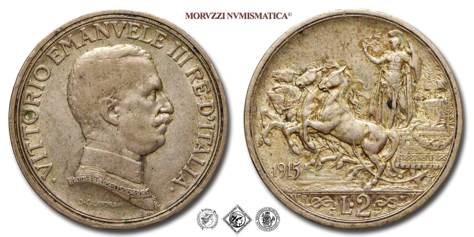 Regno d'Italia, VITTORIO EMANUELE III, 1900-12943, LIRE 2, Quadriga briosa, Emissione: 1915, D/ • VITTORIO • EMANUELE • III • RE • D'ITALIA •, busto in uniforme e con il collare dell'Annunziata del Re a d.; sotto: indicazione del nome dell'autore (D • CALANDRA •), R/ figura allegorica dell'Italia con scudo, elmo e ramo di quercia posta su di un carro trainato da quattro cavalli. Il carro è adorno di festoni, di nodi savoia e presenta il motto FERT; sotto le zampe anteriori dei cavalli: indicazione del millesimo (1915) ; in esergo: indicazione del nominale (L • 2) tra due nodi savoia; sopra il nodo di s.: il segno di zecca (R); sopra il nodo di d.: una stella a cinque punte; sulla linea dell'esergo: a s. il nome dell'autore (D • CALANDRA • M), a d. il nome dell'incisore (A • MOTTI INC •), Zecca di Roma, Rif. bibl. Pagani, 738; Metallo: AR, gr. 10,02, (MI102553), Diam.: mm. 27,07, mBB