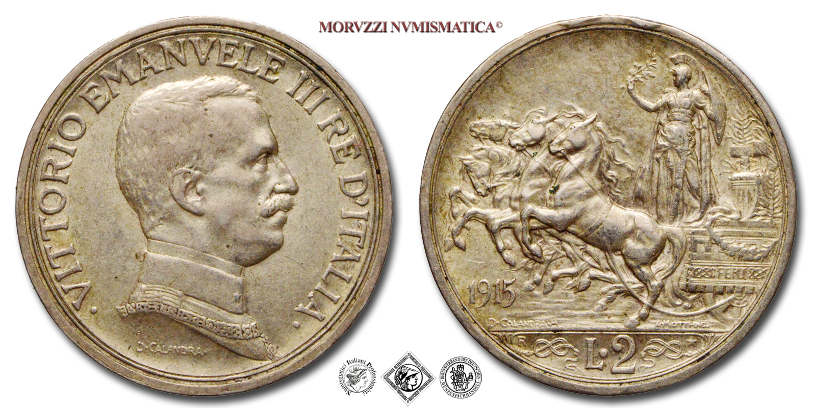 Regno d'Italia, VITTORIO EMANUELE III, 1900-12943, LIRE 2, Quadriga briosa, Emissione: 1915, D/ • VITTORIO • EMANUELE • III • RE • D'ITALIA •, busto in uniforme e con il collare dell'Annunziata del Re a d.; sotto: indicazione del nome dell'autore (D • CALANDRA •), R/ figura allegorica dell'Italia con scudo, elmo e ramo di quercia posta su di un carro trainato da quattro cavalli. Il carro è adorno di festoni, di nodi savoia e presenta il motto FERT; sotto le zampe anteriori dei cavalli: indicazione del millesimo (1915) ; in esergo: indicazione del nominale (L • 2) tra due nodi savoia; sopra il nodo di s.: il segno di zecca (R); sopra il nodo di d.: una stella a cinque punte; sulla linea dell'esergo: a s. il nome dell'autore (D • CALANDRA • M), a d. il nome dell'incisore (A • MOTTI INC •), Zecca di Roma, Rif. bibl. Pagani, 738; Metallo: AR, gr. 9,97, (MI102555), Diam.: mm. 27,06, mBB