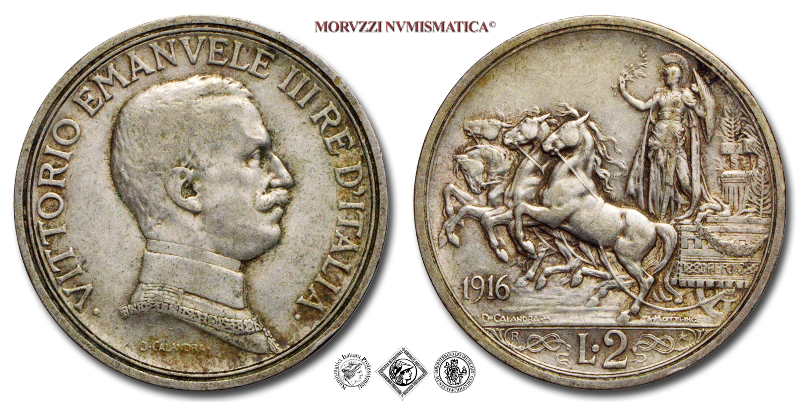 Regno d'Italia, VITTORIO EMANUELE III, 1900-12943, LIRE 2, Quadriga briosa, Emissione: 1916, D/ • VITTORIO • EMANUELE • III • RE • D'ITALIA •, busto in uniforme e con il collare dell'Annunziata del Re a d.; sotto: indicazione del nome dell'autore (D • CALANDRA •), R/ figura allegorica dell'Italia con scudo, elmo e ramo di quercia posta su di un carro trainato da quattro cavalli. Il carro è adorno di festoni, di nodi savoia e presenta il motto FERT; sotto le zampe anteriori dei cavalli: indicazione del millesimo (1916) ; in esergo: indicazione del nominale (L • 2) tra due nodi savoia; sopra il nodo di s.: il segno di zecca (R); sopra il nodo di d.: una stella a cinque punte; sulla linea dell'esergo: a s. il nome dell'autore (D • CALANDRA • M), a d. il nome dell'incisore (A • MOTTI INC •), Zecca di Roma, Rif. bibl. Pagani, 739; Metallo: AR, gr. 10,01, (MI127023), Diam.: mm. 27,11, BB