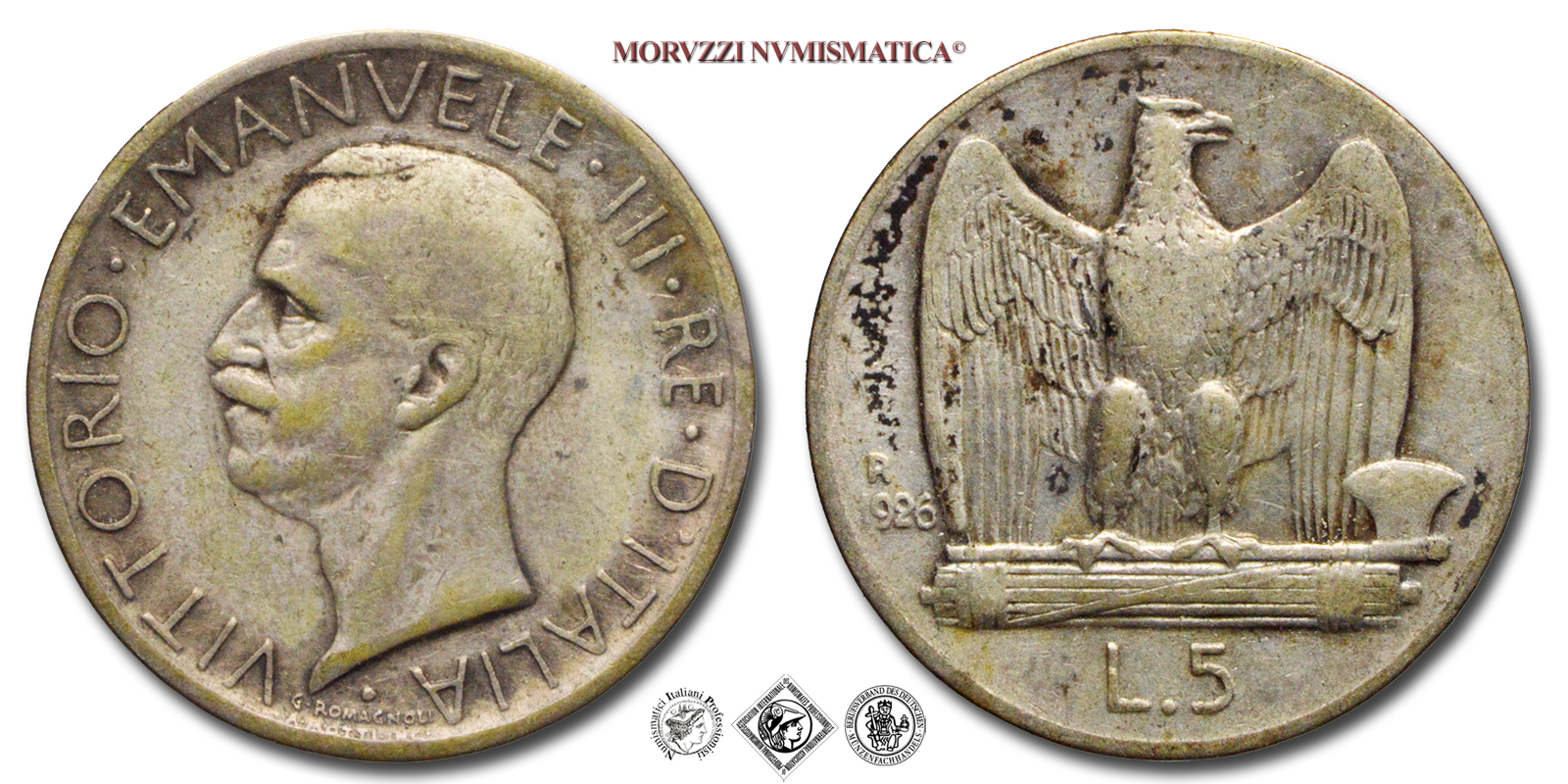 Regno d'Italia, VITTORIO EMANUELE III, 1900-1943, LIRE 5, Aquilotto (Aquilino) - una rosetta, Emissione: 1926, D/ testa nuda del Re volta a sinistra intorno VITTORIO • EMANUELE • II • RE • D'ITALIA • Sotto i nomi dell'incisore (A • MOTTI INC.) e dell'autore (G • ROMAGNOLI) sovrastati da •, R/ VITTORIO • EMANUELE • II • RE • D'ITALIA •, Aquila ad ali leggermente spiegate che ghermisce un fascio orizzontale. In esergo indicazione del valore (L • 5) a sinistra dell'aquila su due righe millesimo (1926) e segno di zecca (R), Zecca di Roma, Rif. bibl. Pagani, 709; Metallo: AR, gr. 4,93, (MI49163), Diam.: mm. 23,09, BB, (R)