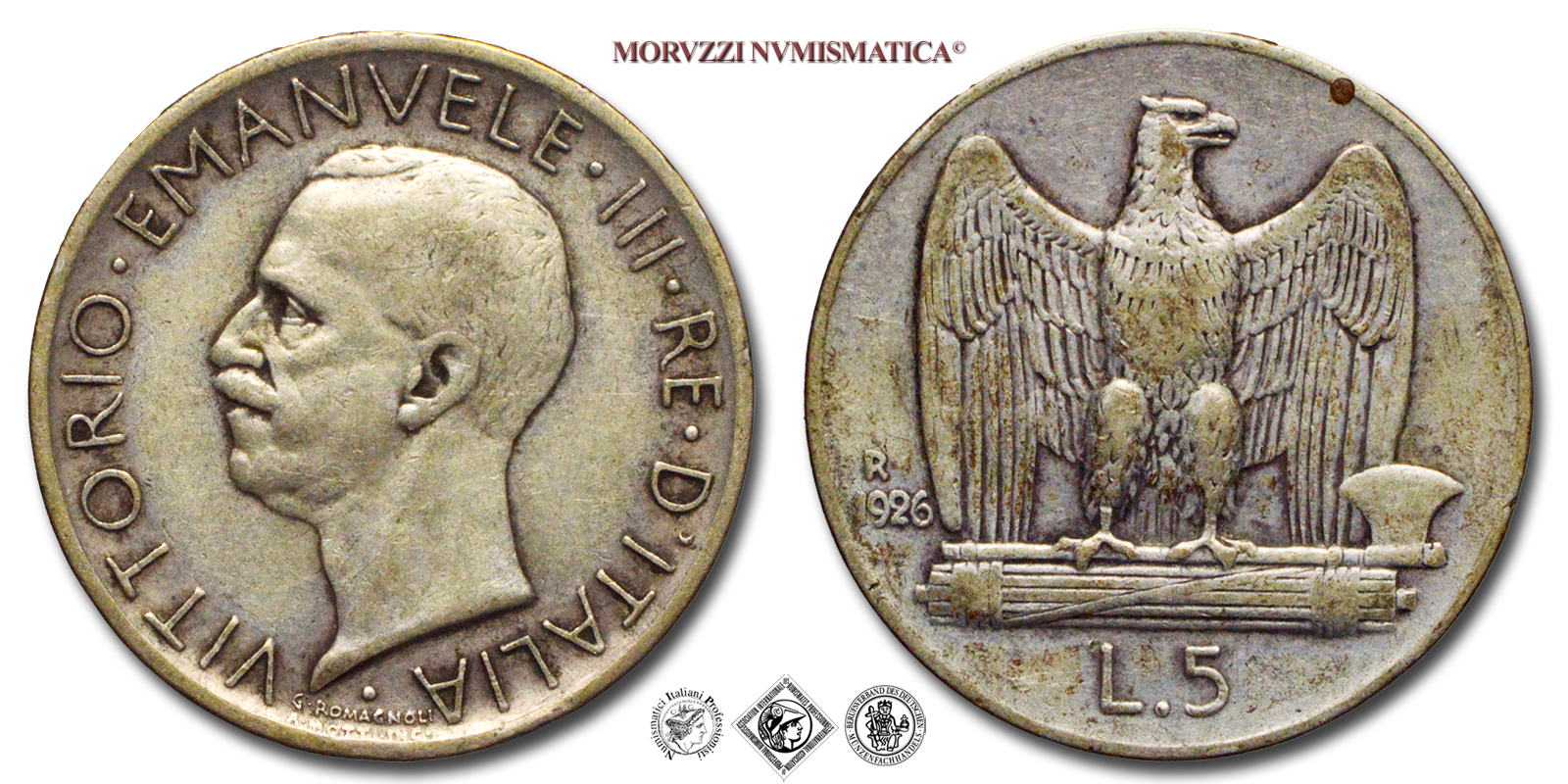 Regno d'Italia, VITTORIO EMANUELE III, 1900-1943, LIRE 5, Aquilotto (Aquilino) - una rosetta, Emissione: 1926, D/ testa nuda del Re volta a sinistra intorno VITTORIO • EMANUELE • II • RE • D'ITALIA • Sotto i nomi dell'incisore (A • MOTTI INC.) e dell'autore (G • ROMAGNOLI) sovrastati da •, R/ VITTORIO • EMANUELE • II • RE • D'ITALIA •, Aquila ad ali leggermente spiegate che ghermisce un fascio orizzontale. In esergo indicazione del valore (L • 5) a sinistra dell'aquila su due righe millesimo (1926) e segno di zecca (R), Zecca di Roma, Rif. bibl. Pagani, 709; Metallo: AR, gr. 5,01, (MI49174), Diam.: mm. 23,09, BB, (R)