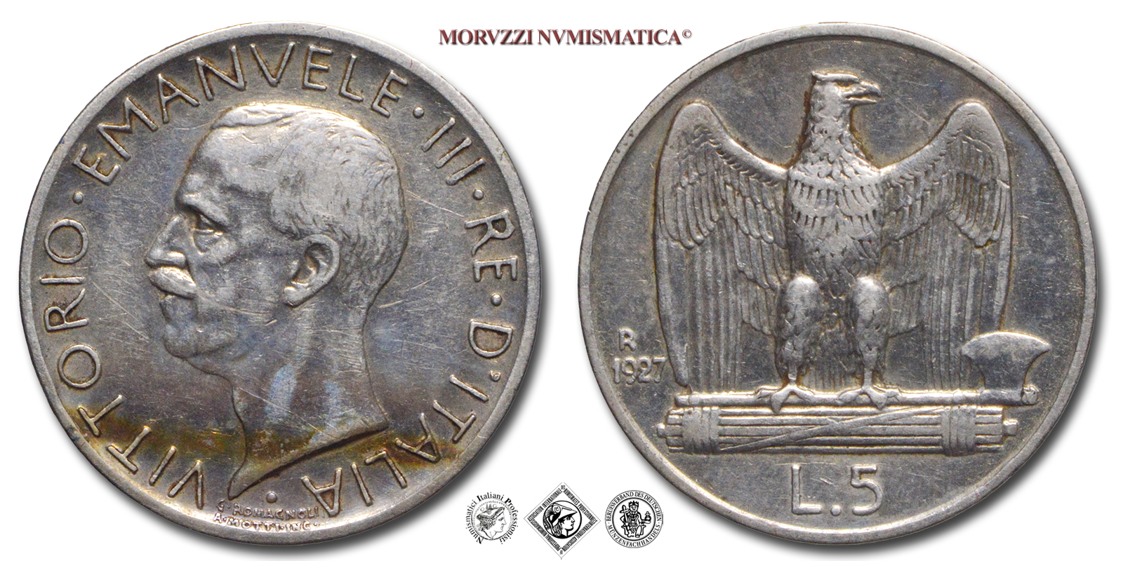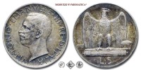 Regno d'Italia, VITTORIO EMANUELE III, 1900-1943, LIRE 5, Aquilotto (Aquilino) - una rosetta, Emissione: 1927, D/ testa nuda del Re volta a sinistra intorno VITTORIO • EMANUELE • II • RE • D'ITALIA • Sotto i nomi dell'incisore (A • MOTTI INC.) e dell'autore (G • ROMAGNOLI) sovrastati da •, R/ VITTORIO • EMANUELE • II • RE • D'ITALIA •, Aquila ad ali leggermente spiegate che ghermisce un fascio orizzontale. In esergo indicazione del valore (L • 5) a sinistra dell'aquila su due righe millesimo (1927) e segno di zecca (R), Zecca di Roma, Rif. bibl. Pagani, 710; Metallo: AR, gr. 4,93, (MI159725), Diam.: mm. 23,09, BB