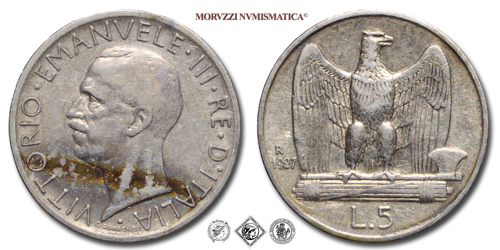 Regno d'Italia, VITTORIO EMANUELE III, 1900-1943, LIRE 5, Aquilotto (Aquilino) - una rosetta, Emissione: 1927, D/ testa nuda del Re volta a sinistra intorno VITTORIO • EMANUELE • II • RE • D'ITALIA • Sotto i nomi dell'incisore (A • MOTTI INC.) e dell'autore (G • ROMAGNOLI) sovrastati da •, R/ VITTORIO • EMANUELE • II • RE • D'ITALIA •, Aquila ad ali leggermente spiegate che ghermisce un fascio orizzontale. In esergo indicazione del valore (L • 5) a sinistra dell'aquila su due righe millesimo (1927) e segno di zecca (R), Zecca di Roma, Rif. bibl. Pagani, 710; Metallo: AR, gr. 4,95, (MI159723), Diam.: mm. 23,12, mBB