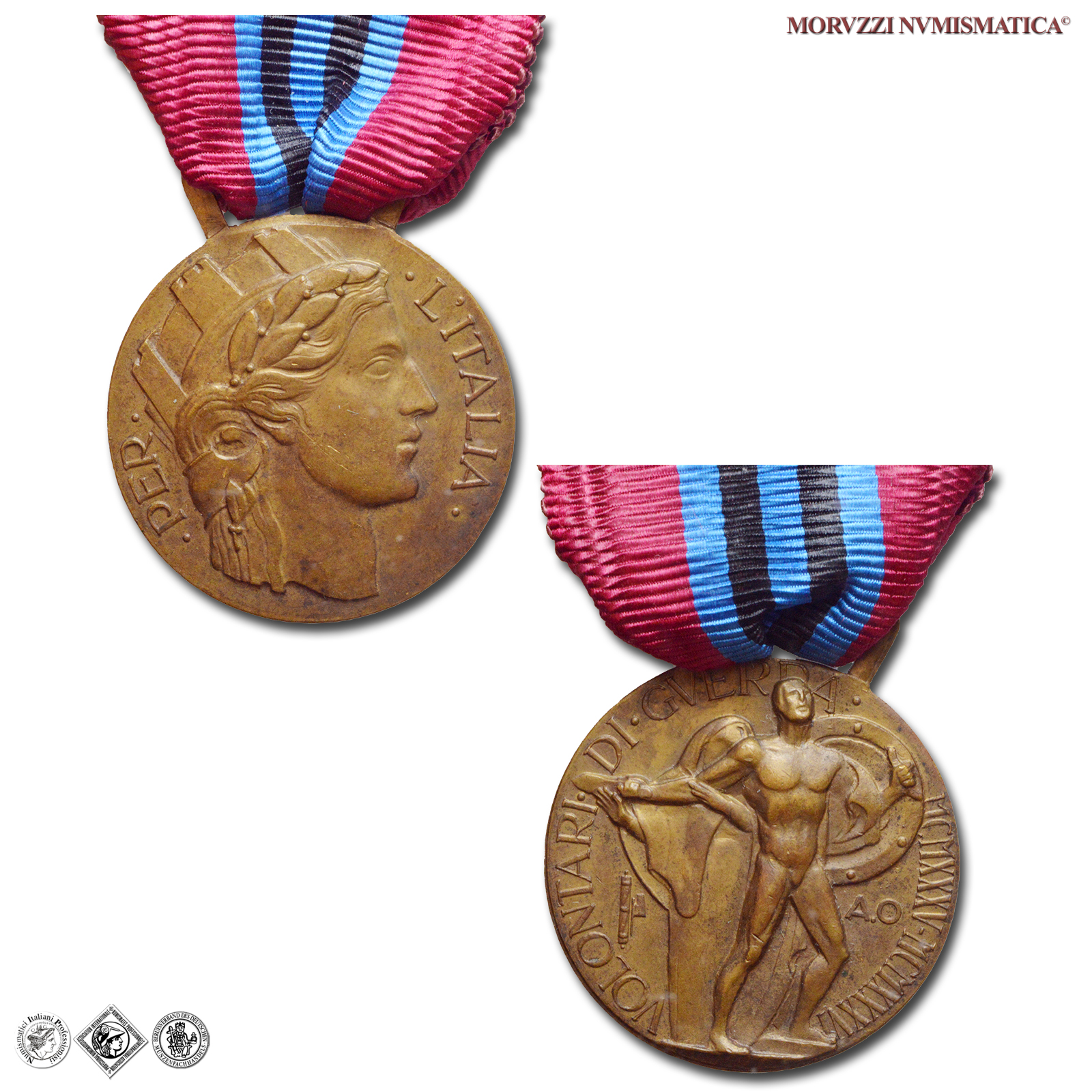 Regno d'Italia, VITTORIO EMANUELE III, MEDAGLIA, Ai volontari della Campagna d'Africa Orientale, Emissione: 1936, D/ • PER • • L'ITALIA •, testa turrita dell'Italia a d., R/ • VOLONTARI • DI • GVERRA • MCMXXXV • MCMXXXVI, figura eroica di volontario con spada e scudo, in piedi di 3/4 a d., alle sue spalle figura di donna velata; ai lati: fascio verticale e A.O, Opus Publio Morbiducci, Rif. bibl. Bini, 137; Metallo: AE, gr. 18,40, (MY139364), Diam.: mm. 33,11, qFDC