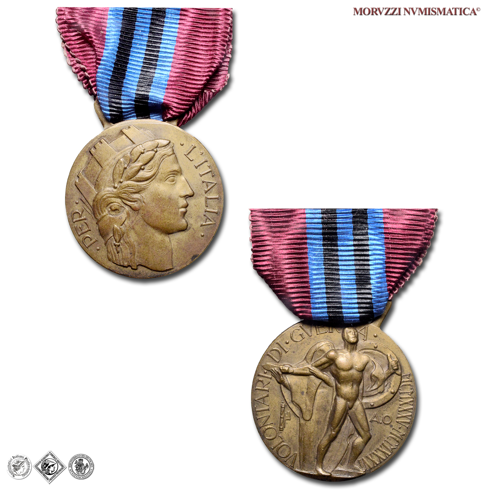 Regno d'Italia, VITTORIO EMANUELE III, MEDAGLIA, Ai volontari della Campagna d'Africa Orientale, Emissione: 1936, D/ • PER • • L'ITALIA •, testa turrita dell'Italia a d., R/ • VOLONTARI • DI • GVERRA • MCMXXXV • MCMXXXVI, figura eroica di volontario con spada e scudo, in piedi di 3/4 a d., alle sue spalle figura di donna velata; ai lati: fascio verticale e A.O, Opus Publio Morbiducci, Rif. bibl. Bini, 137; Metallo: AE, gr. 17,91, (MY139350), Diam.: mm. 33,12, qFDC