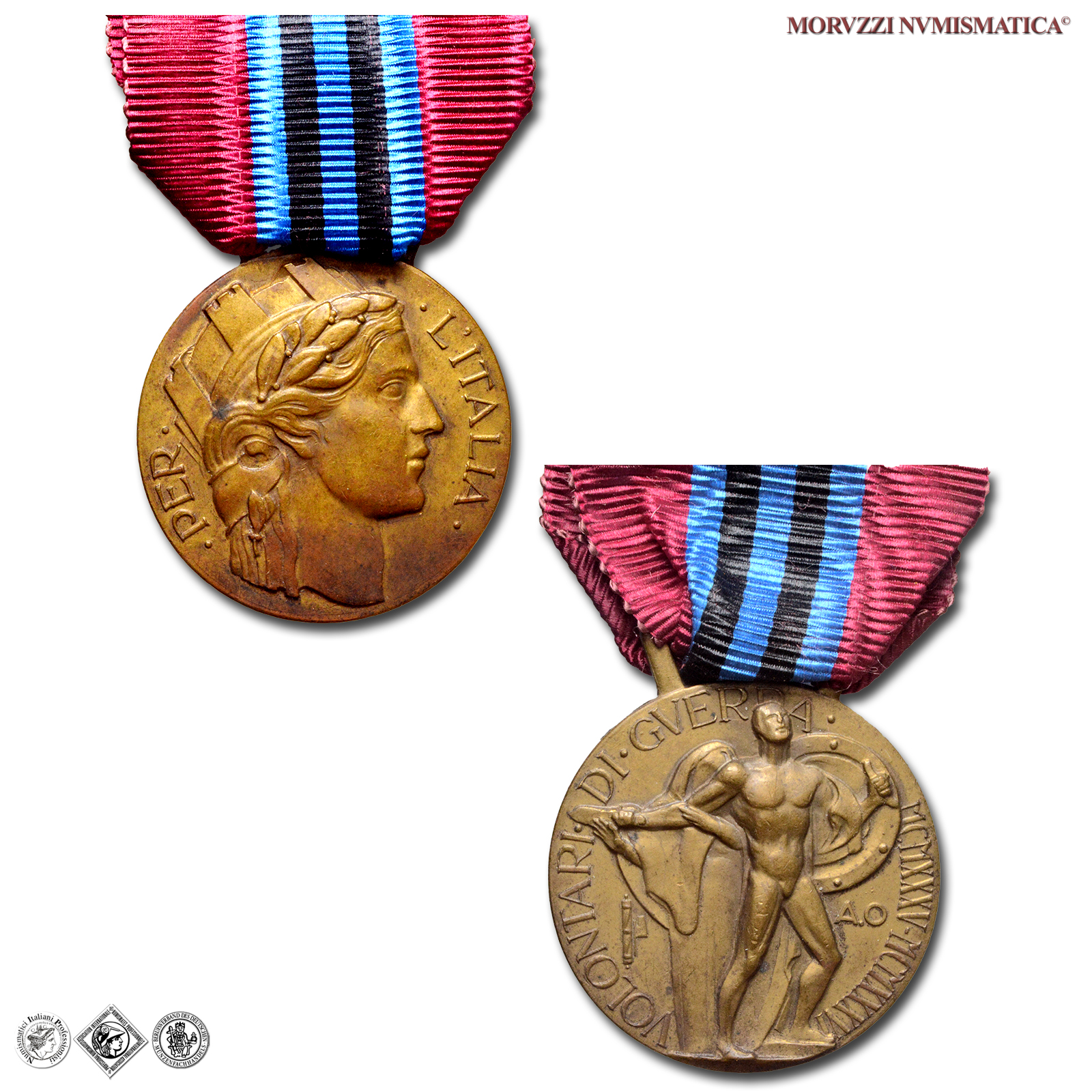 Regno d'Italia, VITTORIO EMANUELE III, MEDAGLIA, Ai volontari della Campagna d'Africa Orientale, Emissione: 1936, D/ • PER • • L'ITALIA •, testa turrita dell'Italia a d., R/ • VOLONTARI • DI • GVERRA • MCMXXXV • MCMXXXVI, figura eroica di volontario con spada e scudo, in piedi di 3/4 a d., alle sue spalle figura di donna velata; ai lati: fascio verticale e A.O, Opus Publio Morbiducci, Rif. bibl. Bini, 137; Metallo: AE, gr. 18,26, (MY139355), Diam.: mm. 33,15, qFDC