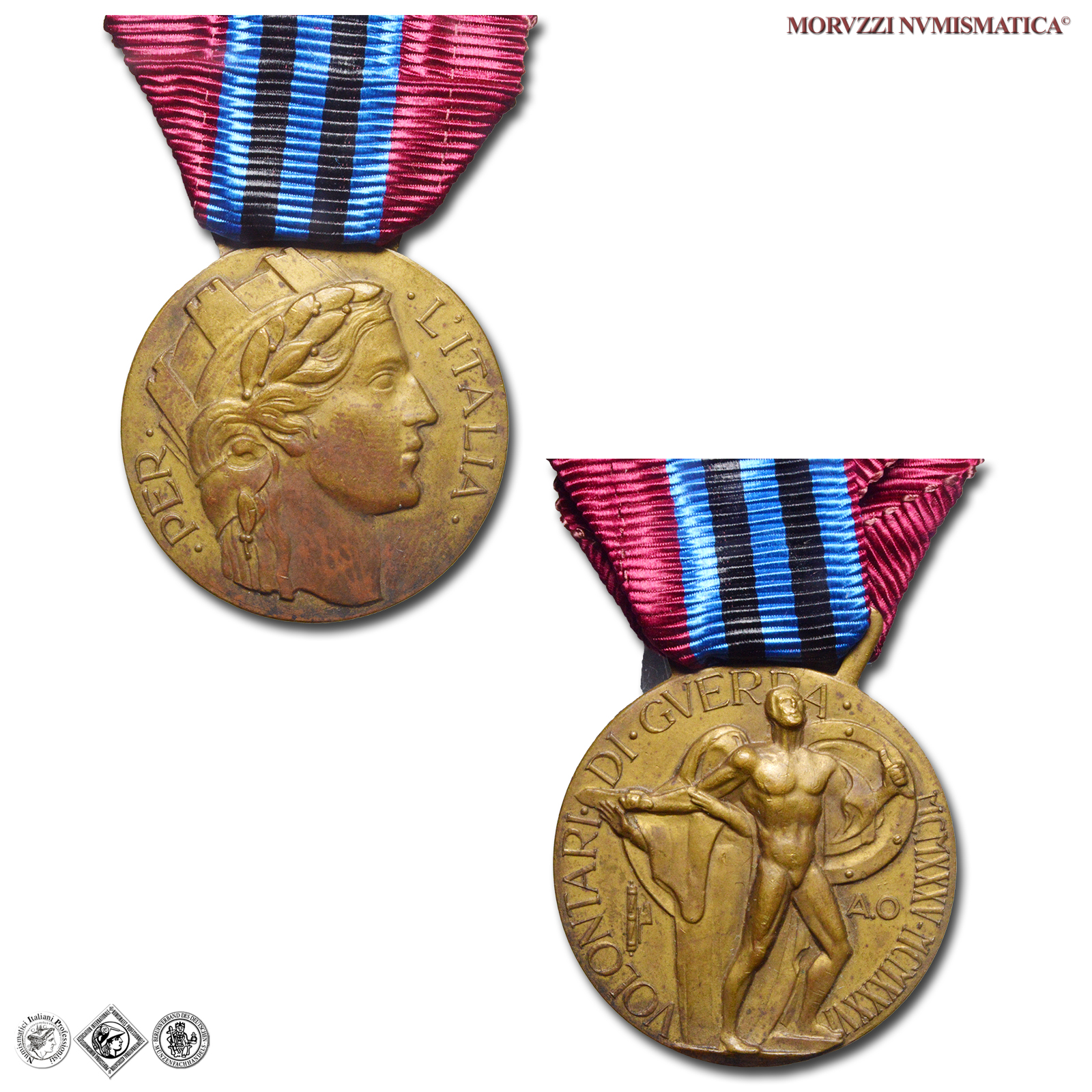 Regno d'Italia, VITTORIO EMANUELE III, MEDAGLIA, Ai volontari della Campagna d'Africa Orientale, Emissione: 1936, D/ • PER • • L'ITALIA •, testa turrita dell'Italia a d., R/ • VOLONTARI • DI • GVERRA • MCMXXXV • MCMXXXVI, figura eroica di volontario con spada e scudo, in piedi di 3/4 a d., alle sue spalle figura di donna velata; ai lati: fascio verticale e A.O, Opus Publio Morbiducci, Rif. bibl. Bini, 137; Metallo: AE, gr. 18,46, (MY139357), Diam.: mm. 33,13, qFDC