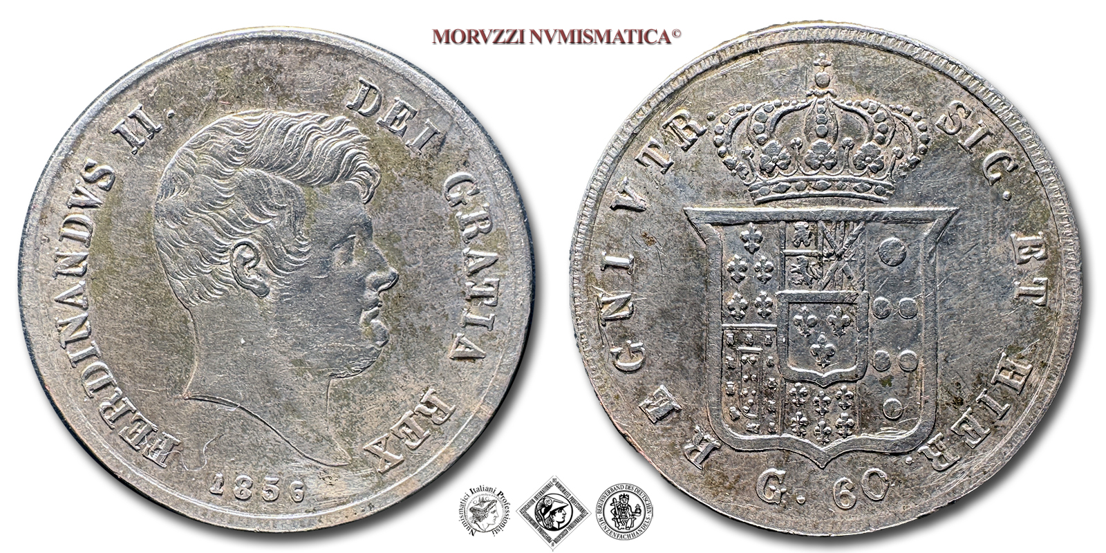 Regno delle due Sicilie, FERDINANDO II DI BORBONE, 1830-1859, GRANA 60, Emissione: 1856, D/ FERDINANDVS II. DEI GRATIA REX, testa nuda del Re a destra. In basso, il millesimo (1856), R/ REGNI VTR. SIC. ET HIER, stemma dei Borbone delle Due Sicilie sormontato da corona. In basso, il valore (G. 60), Zecca di Napoli, Rif. bibl. Pannuti-Riccio, 110; Magliocca, 592; Metallo: AR, gr. 13,73, (MI117627), Diam.: mm. 31,02, mBB
