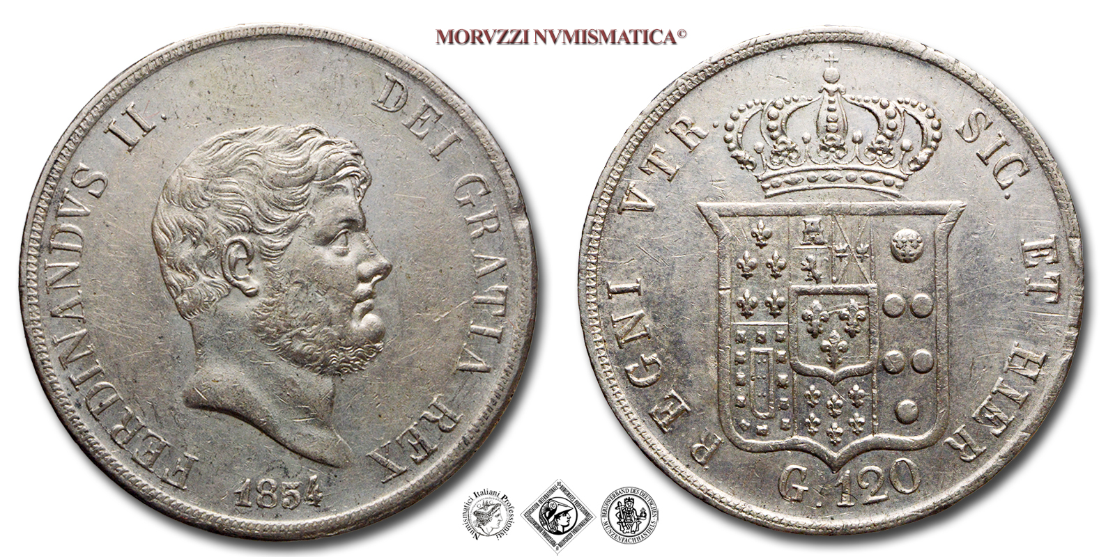 Regno delle due Sicilie, FERDINANDO II DI BORBONE, 1830-1859, GRANA 120, Emissione: 1854, D/ FERDINANDVS II. DEI GRATIA REX, testa nuda del Re a destra. In basso, il millesimo (1854), R/ REGNI VTR. SIC. ET HIER, stemma dei Borbone delle Due Sicilie sormontato da corona. In basso, il valore (G. 120), Zecca di Napoli, Rif. bibl. Pannuti-Riccio, 83; Magliocca, 564; Metallo: AR, gr. 27,53, (MZ163095), Diam.: mm. 37,15, SPL