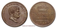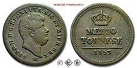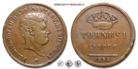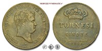 Regno delle due Sicilie, FERDINANDO II DI BORBONE, 1830-1859, TORNESI 5, Emissione: 1848, D FERDINANDVS II • D • G • REGNI VTR • SIC • ET HIER • REX, testa nuda di Ferdinando II rivolta a destra. In basso, sotto il collo può esserci una stella a cinque punte (grande o piccola) o una stellina a sei punte, R/ In alto, la corona reale. Al centro su due righe, TORNESI || CINQUE. In esergo, la data (1848), Zecca di Napoli, Rif. bibl. Pagani, 370a; Pannuti-Riccio, 221; Metallo: CU, gr. 16,30, (MZ92217), Diam.: mm. 31,97, qFDC