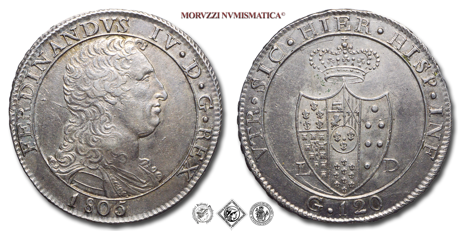 Regno di Napoli, FERDINANDO IV DI BORBONE, 1759-1825, GRANA 120, Emissione: 1805, D/ FERDINANDVS IV • D • G • REX 1805, busto drappeggiato a destra, R/ VIR • SIC • HIER • HISP • INF G.120, stemma coronato; ai lati: L D, Zecca di Napoli, Rif. bibl. Pannuti-Riccio, 9; Magliocca, 391; Metallo: AR, gr. 27,73, (MZ160666), Diam.: mm. 38,10, qSPL