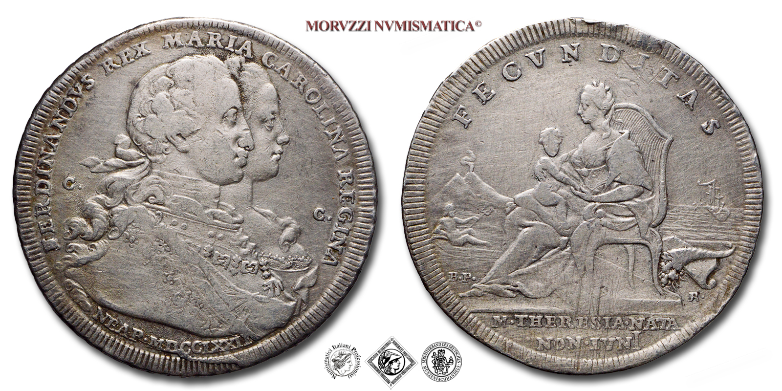 Regno di Napoli, FERDINANDO IV DI BORBONE, 1759-1816, PIASTRA, Emissione: 1772, D/ FERDINANDVS REX MARIA CAROLINA REGINA, busti accollati del re e della regina, ai lati C. - C. (Cesare Coppola), sotto, lungo il bordo, NEAP • MDCCLXXII, R/ FECVNDITAS, donna seduta in trono (Maria Carolina) con bambino in braccio, sullo sfondo il mare, a sinistra il Vesuvio e Sebeto, ed a destra un veliero ed una cornucopia. In basso a sinistra B.P. (Bernardo Perger, incisore) ed a destra R.(Giovanni Russo, maestro di Prova). All'esergo, su due righe, M • THERESIA • NATA / NON • IVNI, Zecca di Napoli, Rif. bibl. Pannuti-Riccio, 47; Magliocca, 240; Metallo: AR, gr. 25,30, (MZ162446), Diam.: mm. 41,01, BB, (R)