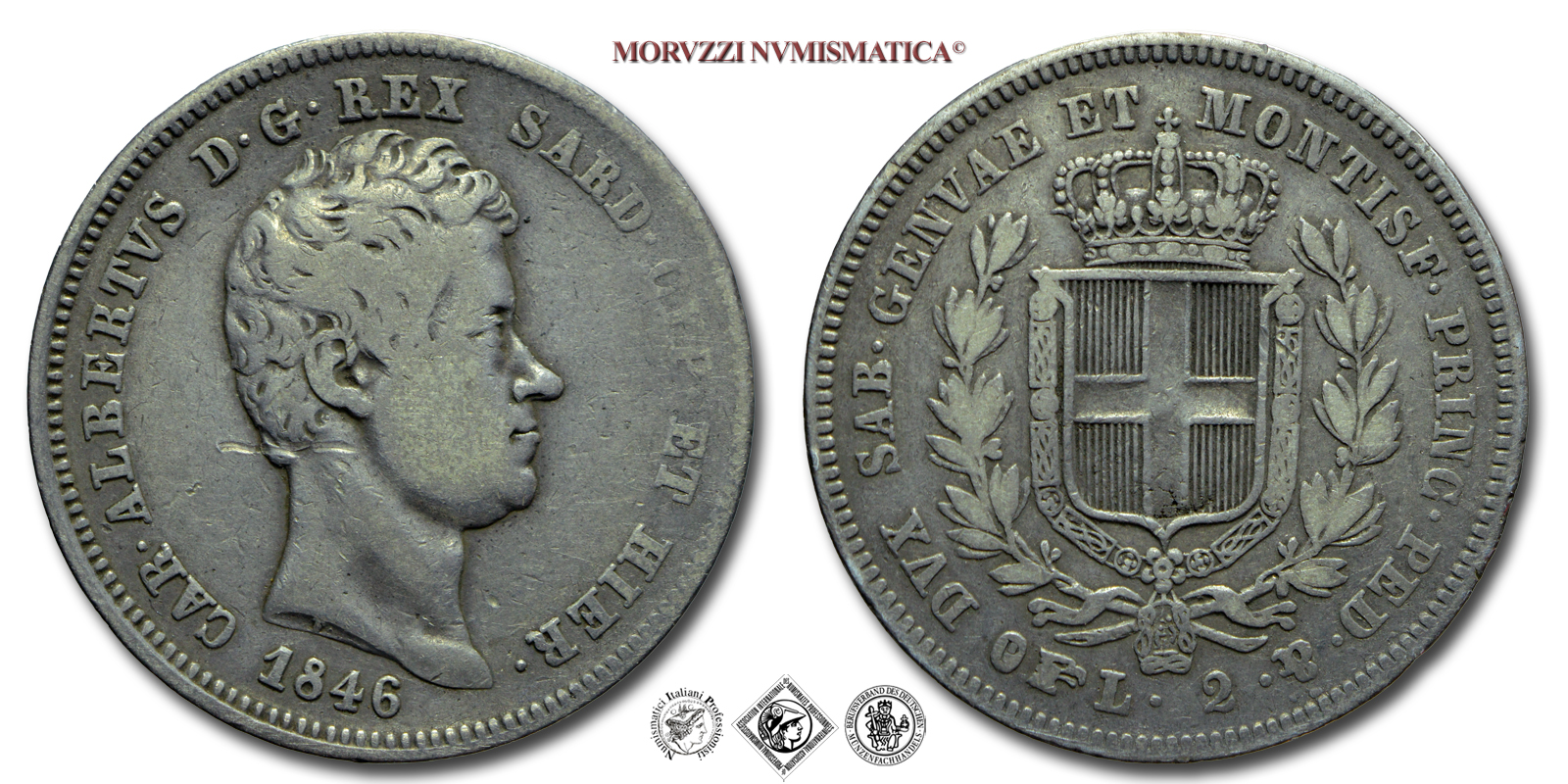 Regno di Sardegna, CARLO ALBERTO, 1831-1849, 2 LIRE, Emissione: 1846, D/ testa nuda del Re a destra, al di sotto della quale si trova il millesimo (1846). Lungo il bordo, CAR • ALBERTVS D • G • REX SARD • CYP • ET HIER • Sul taglio del collo indicazione dell'autore (F per Ferraris), D/ stemma con croce Sabauda sovrastato da Corona Reale e fregiato dal collare dell'Annunziata tra rami di lauro. Lungo il bordo: DVX SAB • GENVAE ET MONTISF • PRINC • PED • & •. In basso, da sinistra a destra, segno di zecca (P in incuso all'interno di un ovale e testa d'aquila) e indicazione del valore (L • 2), Zecca di Torino, Rif. bibl. Pagani, 285; Metallo: AR, gr. 9,82, (MI107011), Diam.: mm. 27,08, MB, (RR)