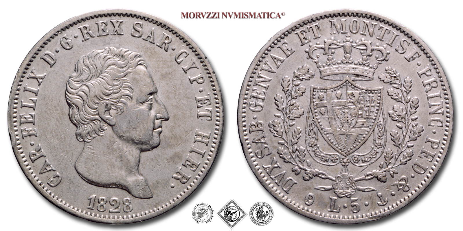 Emissione: 1828, Zecca di Genova, Rif. bibl. Pagani, 74; Metallo: AR, gr. 24,83, (MI151693), Diam.: mm. 37,31, qSPL