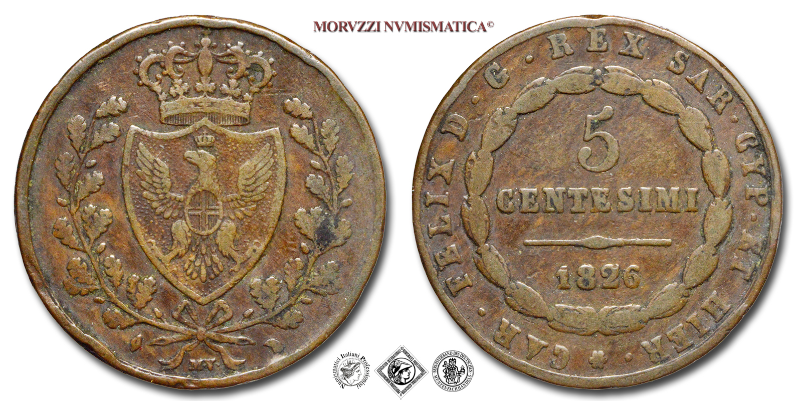 Regno di Sardegna, CARLO FELICE, 1821-1831, CENTESIMI 5, L in losanga, Emissione: 1826, D/ Nel campo indicazione del valore (5 CENTESIMI), fregio e millesimo (1826) su quattro righe, intorno corona di lauro e la scritta CAR • FELIX D • G • REX SAR • CYP • ET HIER •. Sotto una rosetta, R/ Scudo con aquila Sabauda sormontato da corona reale e circondato da rami di quercia. In basso iniziali dell'autore (M. V.) e segno di zecca (L in incuso all'interno di una losanga e testina d'aquila), Zecca di Torino, Rif. bibl. Pagani, 127; Metallo: CU, gr. 9,40, (MI84020), Diam.: mm. 28,10, qBB