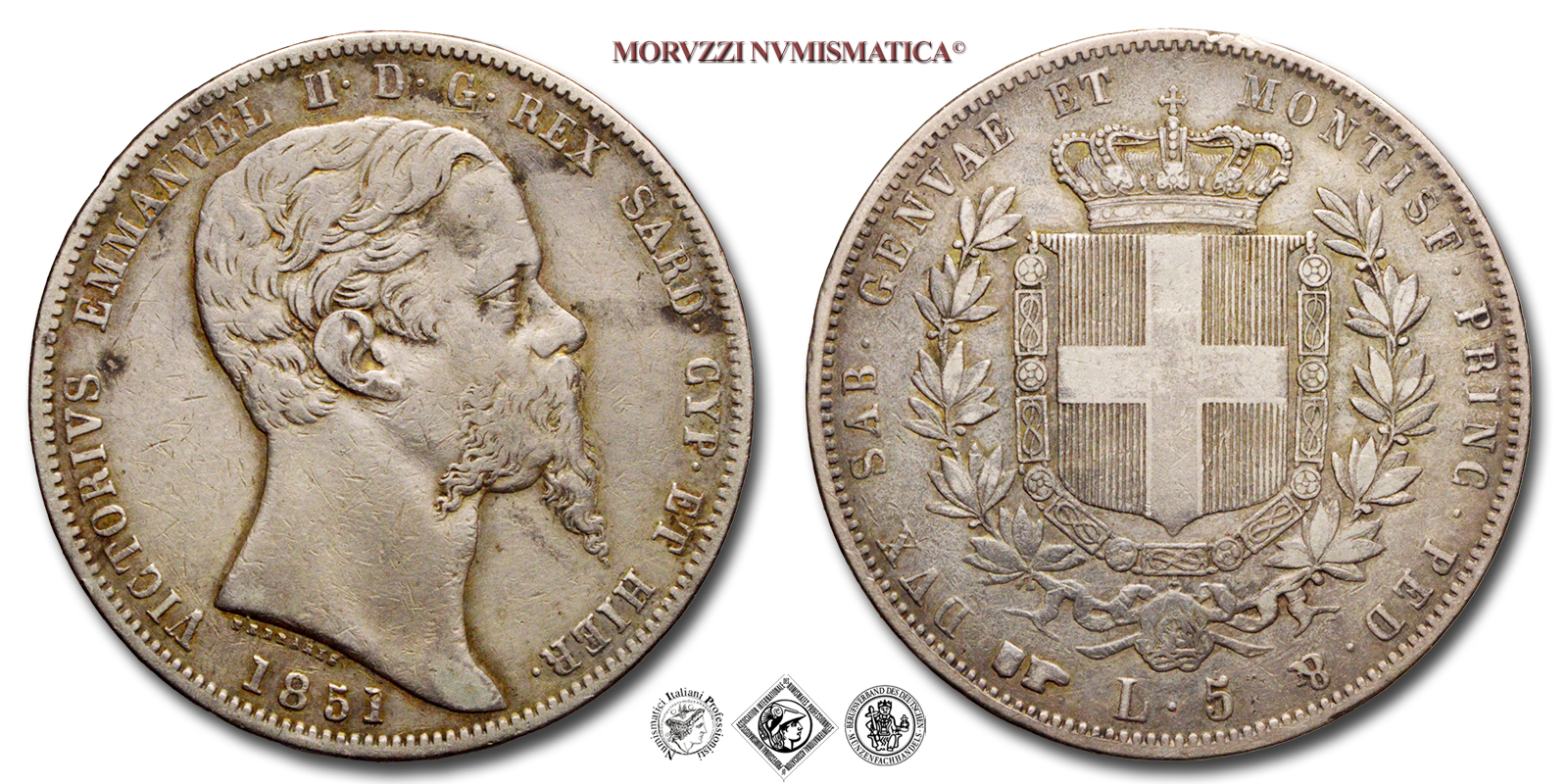 Regno di Sardegna, VITTORIO EMANUELE II, 1849-1861, LIRE 5, Emissione: 1851, D/ VICTORIUS EMMANVEL II • D • G • REX SARD CYP • ET HIER •, testa nuda del Re a d.; sul taglio del collo: indicazione dell'autore (FERRARIS); sotto: millesimo (1851), R/ DVX SAB • GENVAE ET MONTISF • PRINC • PED • &, stemma con croce Sabauda sovrastato da Corona Reale e fregiato dal collare dell'Annunziata tra rami di lauro; in basso, lungo il bordo: segno di zecca (B in incuso all'interno di uno scudetto e testa d'aquila) e indicazione del valore (L • 5), Zecca di Torino, Rif. bibl. Pagani, 372; Metallo: AR, gr. 24,76, (MI162867), Diam.: mm. 37,09, BB, (R)