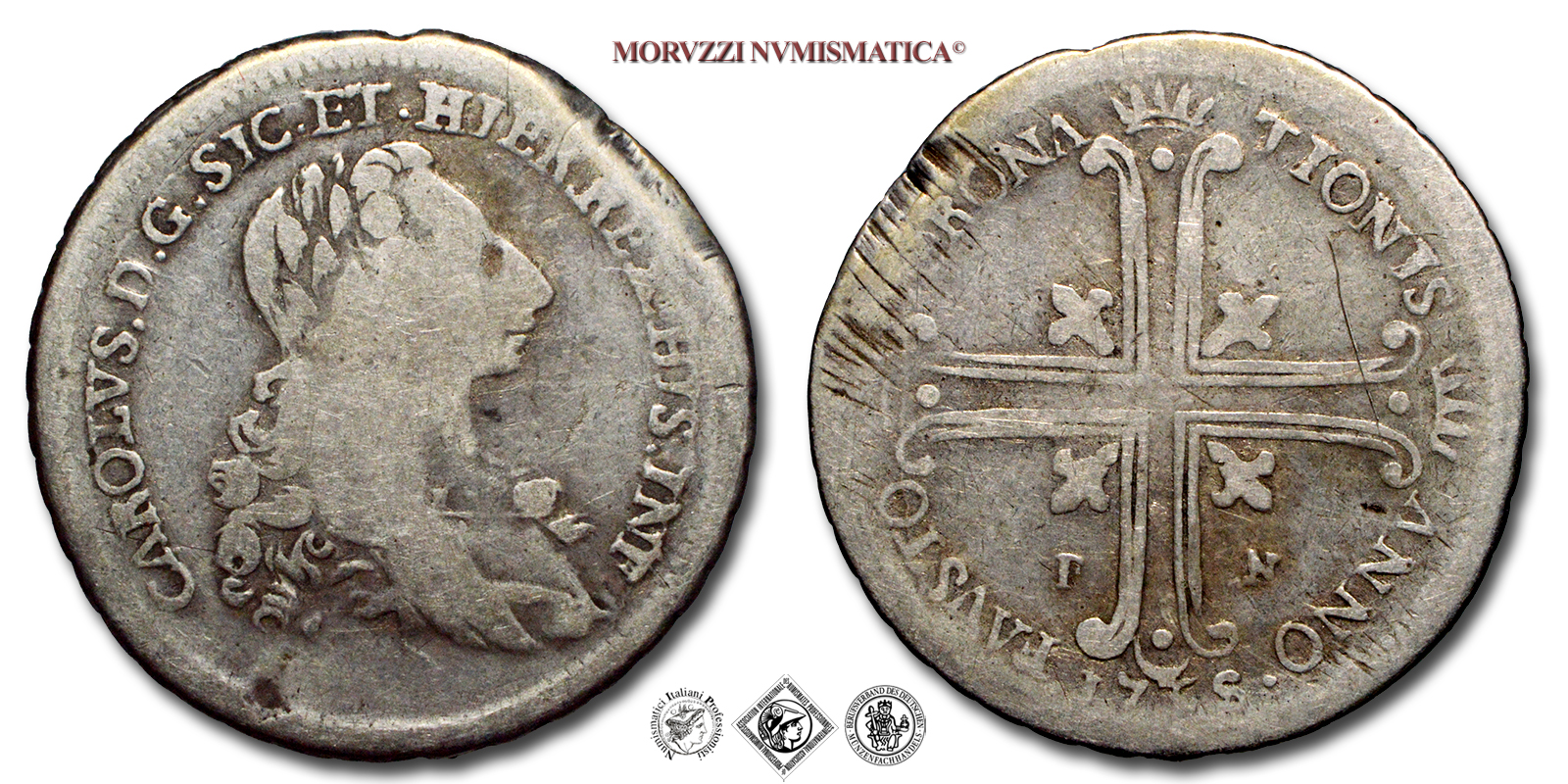 Regno di Sicilia, CARLO DI BORBONE, 1734-1759, TARI' 6, Incoronazione, Emissione: 1735, D/ CAROLVS • D • G • SIC • ET • HIER • REX • HIS • INF (caratteri piccoli), busto laureato rivolto a destra, R/ FAVSTO / CORONA / TIONIS / ANNO in basso 1735, croce greca con bracci scanalati e globetti all'interno, tutti i bracci sormontati da corone a cinque punte. In ogni angolo della croce un giglio, e in basso FN (sigla dello zecchiere Francesco Notarbartolo), Zecca di Palermo, Rif. bibl. Spahr, 19; Metallo: AR, gr. 12,71, (MZ93419), Diam.: mm. 33,50, MB