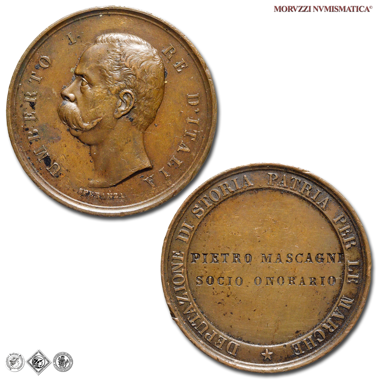 Regno d'Italia, UMBERTO I, 1878-1900, MEDAGLIA, Emissione: s.d., D/ UMBERTO I RE D'ITALIA, testa nuda a sinistra; sotto: SPERANZA, R/ DEPUTAZIONE DI STORIA PATRIA PER LE MARCHE, PIETRO MASCAGNI SOCIO ONORARIO, Opus Speranza, Metallo: AE, gr. 47,98, (MY159334), Diam.: mm. 46,70, qSPL, (RR)