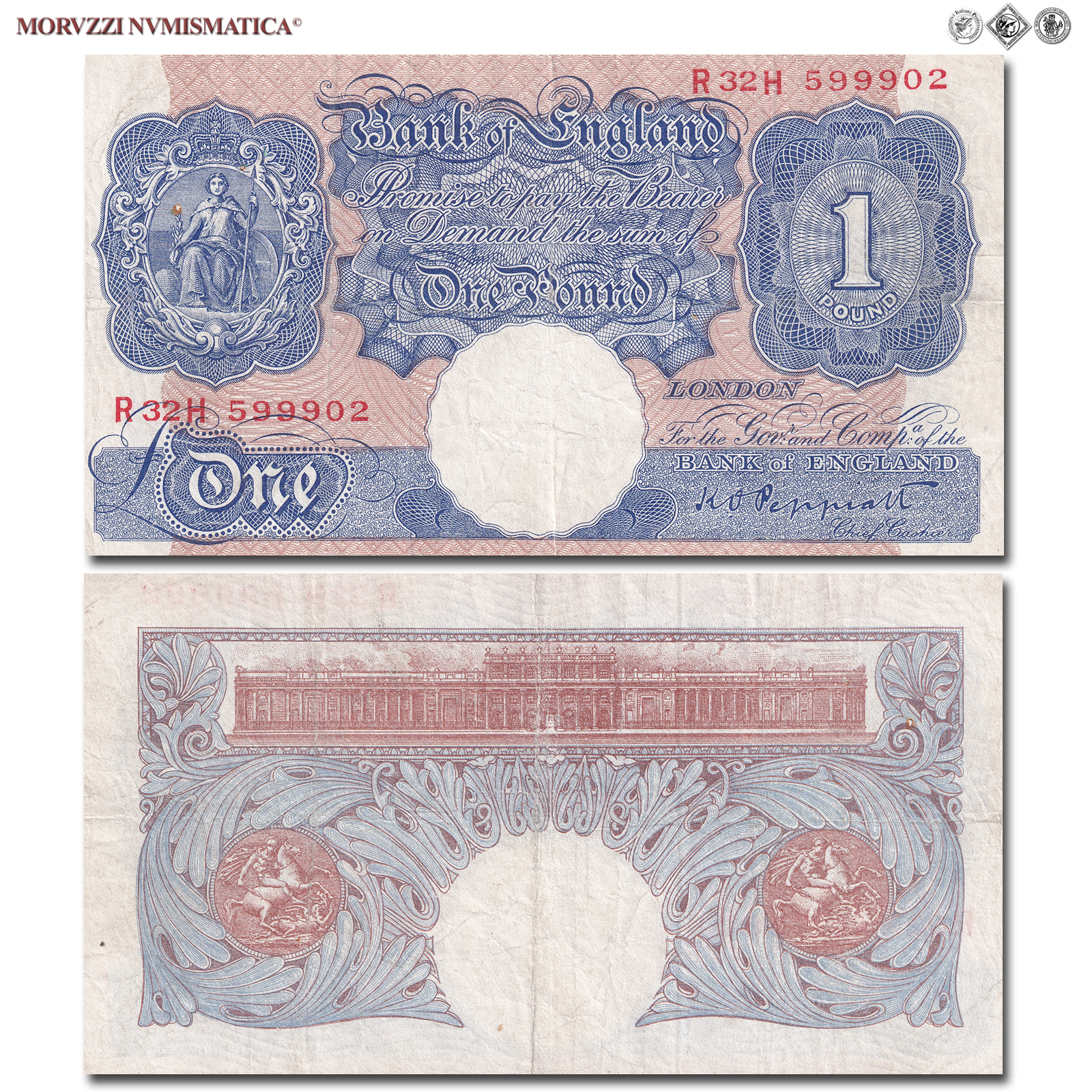 Regno Unito di Gran Bretagna, BANK OF ENGLAND, POUND, Blue notes, Marzo 1940, D/ Blu chiaro o scuro e rosa. Figura seduta della Britannia in alto a sinistra. Scritta: Bank of England / I Promise to pay the Bearer / on Demand the sum of / One Pound / London / For the Govr. and Compa. of the / BANK of ENGLAND. Incisore: W M Keesey, R/ Edificio della Banca d'Inghilterra in alto. Sovrani a sinistra e a destra. Incisore: W M Keesey, Rif. bibl. Pick, 367; Banknotes yearbook, 47e; (CE49356), Firme: K. O. Peppiatt, n° di serie: R 32 H 599902, mBB