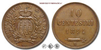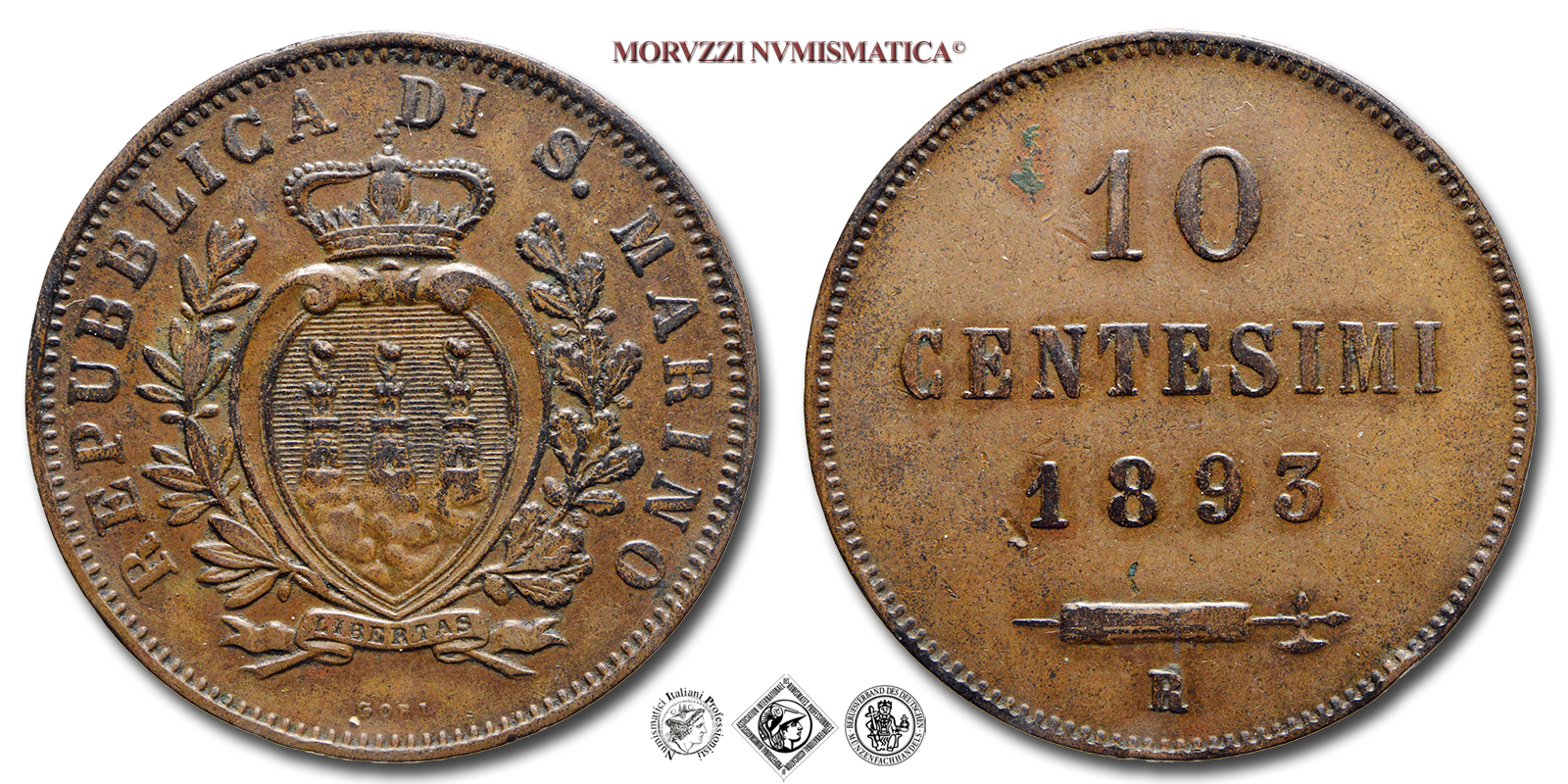 Repubblica di San Marino, VECCHIA MONETAZIONE, 1864-1906, 10 CENTESIMI, Emissione: 1893, D/ Stemma araldico di San Marino con le tre torri attorniato da un ramo di ulivo (o lauro) e uno di quercia. In alto corona simbolo della sovranità di San Marino. In basso, cartiglio recante LIBERTAS in incuso e indicazione dell'autore (GORI). Intorno REPUBBLICA DI S • MARINO, R/ Valore (10 CENTESIMI) e millesimo (1893) su tre righe. Sotto fascio littorio con scure in orizzontale; in basso: il segno di zecca (R), Zecca di Roma, Rif. bibl. Pagani, 371; Metallo: CU, gr. 9,88, (MZ156763), Diam.: mm. 30,30, mBB