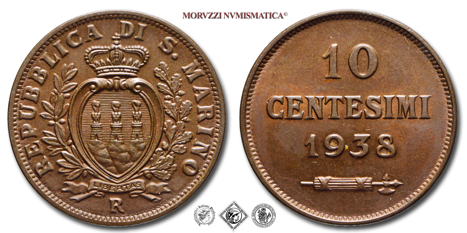 Repubblica di San Marino, VECCHIA MONETAZIONE, 1864-1906, 10 CENTESIMI, Emissione: 1938, D/ REPUBBLICA DI S • MARINO, stemma araldico di San Marino con le tre torri piumate attorniato da un ramo di ulivo (o lauro) e uno di quercia. In alto corona simbolo della sovranità di San Marino. In basso, cartiglio recante LIBERTAS in incuso e segno di zecca (R), R/ valore (10 CENTESIMI) e millesimo (1938) su tre righe, in basso fascio con scure in orizzontale, Zecca di Roma, Rif. bibl. Pagani, 376; Metallo: AE, gr. 5,47, (MZ156771), Diam.: mm. 22,61, FDC