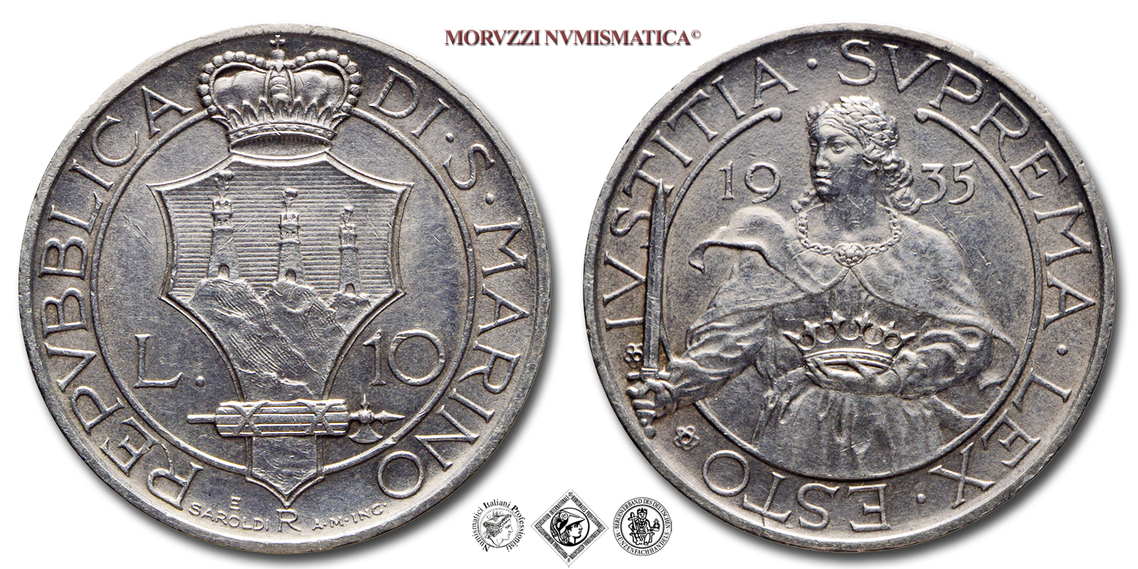 Repubblica di San Marino, VECCHIA MONETAZIONE, 1864-1938, 10 LIRE, Emissione: 1935, D/ All'interno di un cerchio, stemma araldico di San Marino con le tre torri piumate e sormontato dalla corona della sovranità. Ai suoi lati indicazione del valore (L • 10) e, in basso, un fascio con scure in orizzontale. Intorno, REPVBBLICA DI • S • MARINO, in basso indicazione degli autori (E • SAROLDI A • M • INC.) e il segno di zecca (R), R/ All'interno di un cerchio (incompleto), busto di Sant'Agata vista di fronte con testa volta a sinistra mentre regge una spada con la destra e una corona con la sinistra, ai suoi lati le cifre del millesimo (1935). Intorno IVSTITIA • SVPREMA • LEX • ESTO preceduta e seguita da una rosetta a sei petali, Zecca di Roma, Rif. bibl. Pagani, 353; Metallo: AR, gr. 10,01, (MZ156785), Diam.: mm. 27,11, SPL