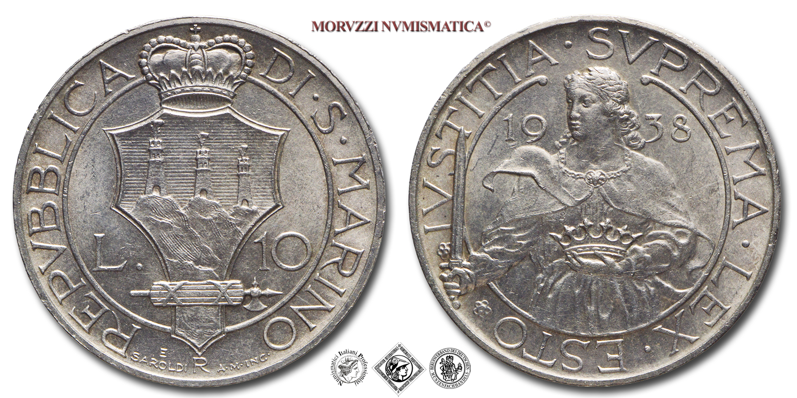 Repubblica di San Marino, VECCHIA MONETAZIONE, 1864-1938, 10 LIRE, Emissione: 1938, D/ All'interno di un cerchio, stemma araldico di San Marino con le tre torri piumate e sormontato dalla corona della sovranità. Ai suoi lati indicazione del valore (L • 10) e, in basso, un fascio con scure in orizzontale. Intorno, REPVBBLICA DI • S • MARINO, in basso indicazione degli autori (E • SAROLDI A • M • INC.) e il segno di zecca (R), R/ All'interno di un cerchio (incompleto), busto di Sant'Agata vista di fronte con testa volta a sinistra mentre regge una spada con la destra e una corona con la sinistra, ai suoi lati le cifre del millesimo (1938). Intorno IVSTITIA • SVPREMA • LEX • ESTO preceduta e seguita da una rosetta a sei petali, Zecca di Roma, Rif. bibl. Pagani, 356; Metallo: AR, gr. 10,00, (MZ156790), Diam.: mm. 27,04, mSPL