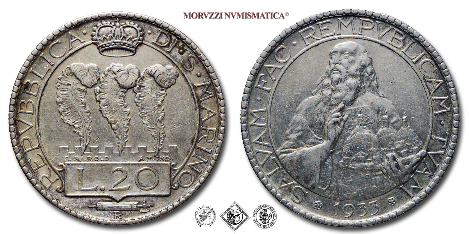 Repubblica di San Marino, SECONDA MONETAZIONE, 1931-1938, 20 LIRE, Emissione: 1933, D/ All'internodi un cerchio (incompleto), busto di San Marino visto di fronte con testa leggermente volta a sinistra mentre regge il monte Titano con la sinistra e lo benedice con la destra. Intorno, SALVAM • FAC • REMPVBLICAM • TUAM tra due rosette a sei petali. In basso il millesimo (1933), R/ All'interno di un cerchio, merlatura con le tre piume araldiche di San Marino. In alto corona rappresentante la sovranità sammarinese. In basso indicazione del valore (L • 20) all'interno di un quadretto. In esergo, fascio con scure posto in orizzontale al di sotto del quale si trova il segno di zecca (R). Sopra il quadretto del valore indicazione degli autori (E. SAROLDI e A • M • INC •). Intorno • REPVBBLICA • DI • S • MARINO •, Zecca di Roma, Rif. bibl. Pagani, 345; Metallo: AR, gr. 14,96, (MZ156777), Diam.: mm. 35,54, qSPL