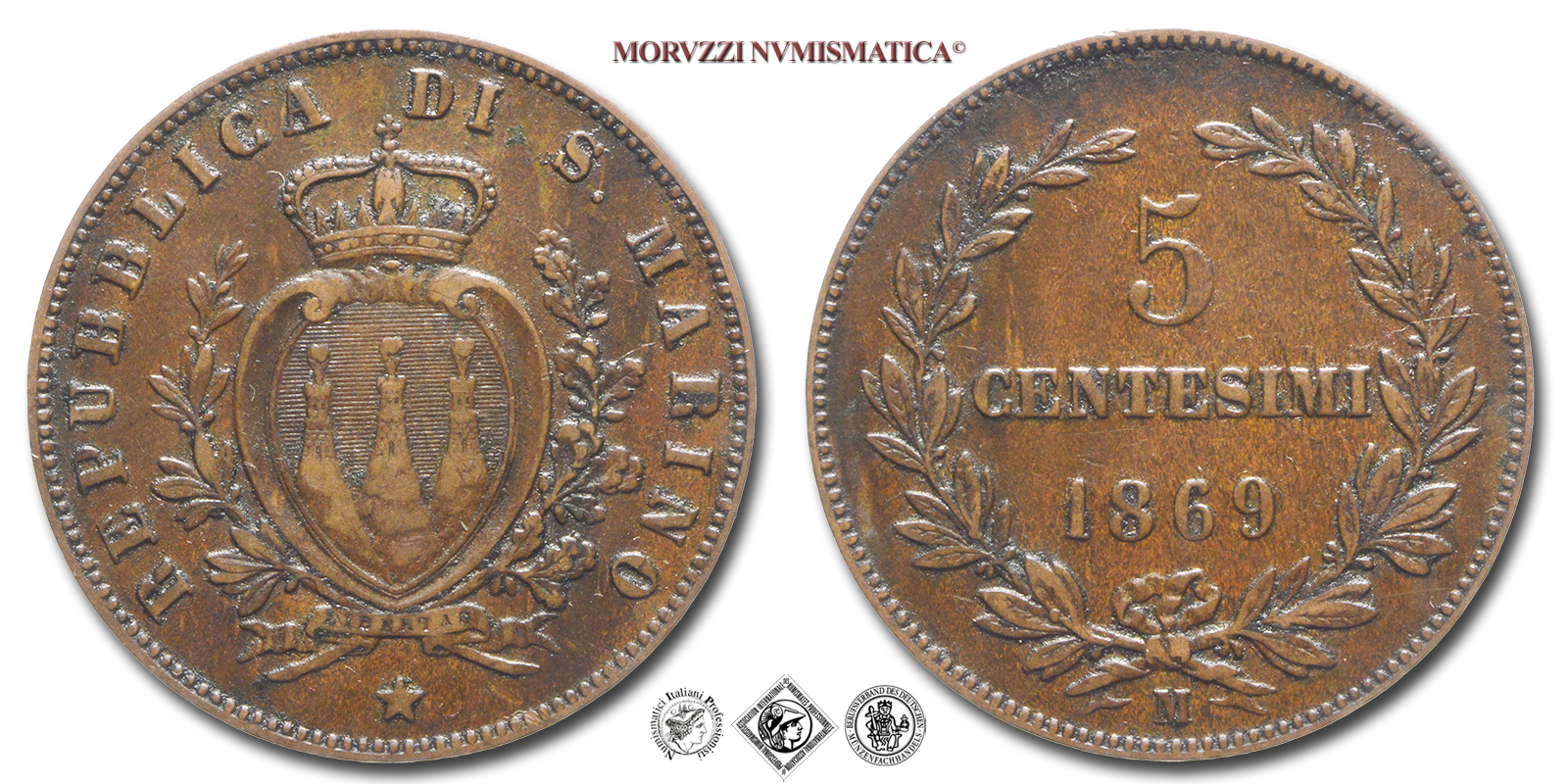 Repubblica di San Marino, VECCHIA MONETAZIONE, 1864-1906, 5 CENTESIMI, Emissione: 1869, D/ Valore (5 CENTESIMI) e millesimo (1869) su tre righe contornato da due rami di alloro, in basso il segno di zecca (M), R/ Stemma araldico di San Marino con le tre torri attorniato da un ramo di ulivo (o lauro) e uno di quercia. In alto corona simbolo della sovranità di San Marino. In basso, cartiglio recante LIBERTAS in incuso e stelletta. Intorno REPUBBLICA DI S • MARINO, Zecca di Milano, Rif. bibl. Pagani, 378; Metallo: CU, gr. 5,11, (MZ153176), Diam.: mm. 25,00, mBB