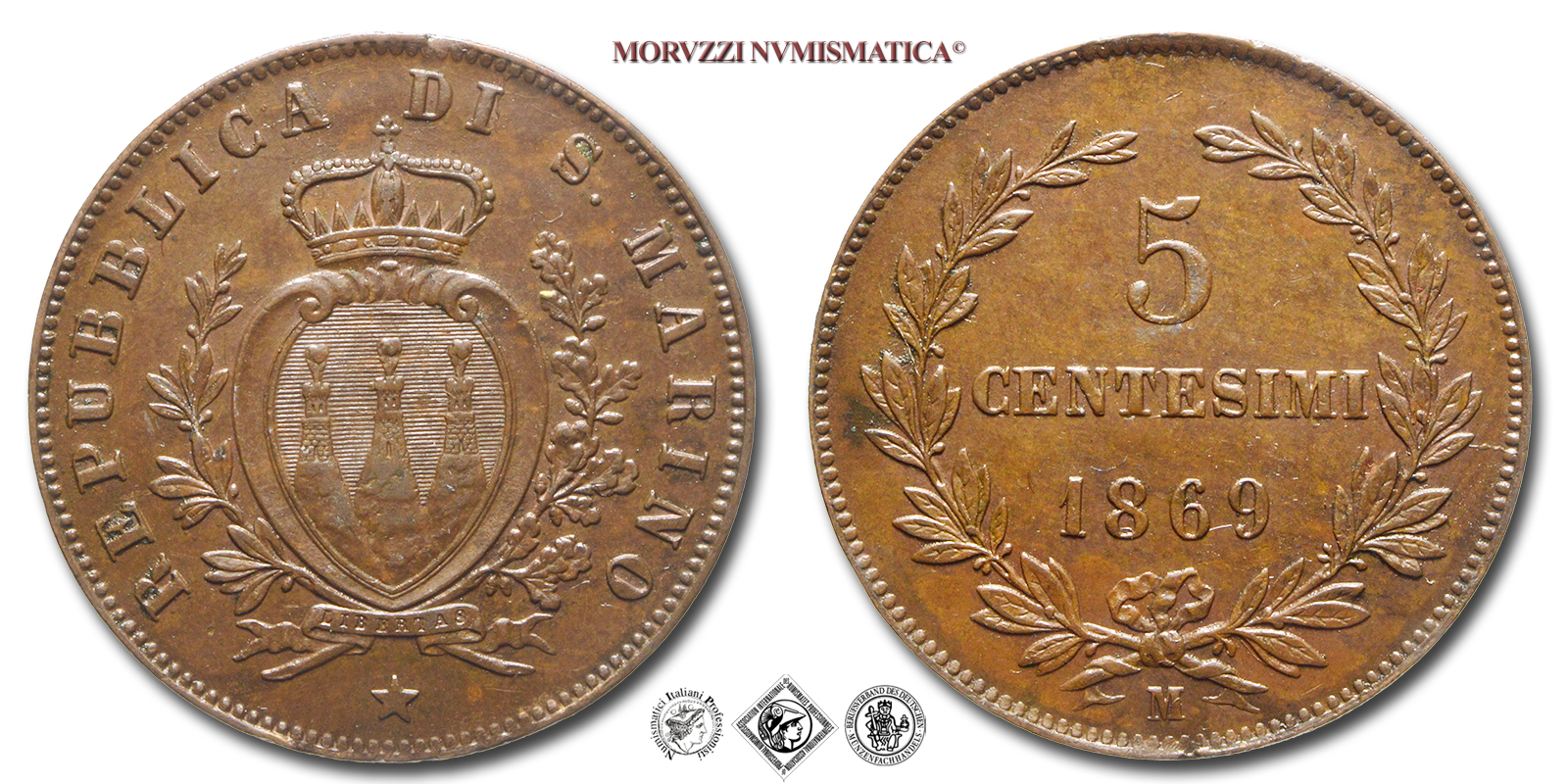 Repubblica di San Marino, VECCHIA MONETAZIONE, 1864-1906, 5 CENTESIMI, Emissione: 1869, D/ Valore (5 CENTESIMI) e millesimo (1869) su tre righe contornato da due rami di alloro, in basso il segno di zecca (M), R/ Stemma araldico di San Marino con le tre torri attorniato da un ramo di ulivo (o lauro) e uno di quercia. In alto corona simbolo della sovranità di San Marino. In basso, cartiglio recante LIBERTAS in incuso e stelletta. Intorno REPUBBLICA DI S • MARINO, Zecca di Milano, Rif. bibl. Pagani, 378; Metallo: CU, gr. 5,12, (MZ153180), Diam.: mm. 25,10, mBB