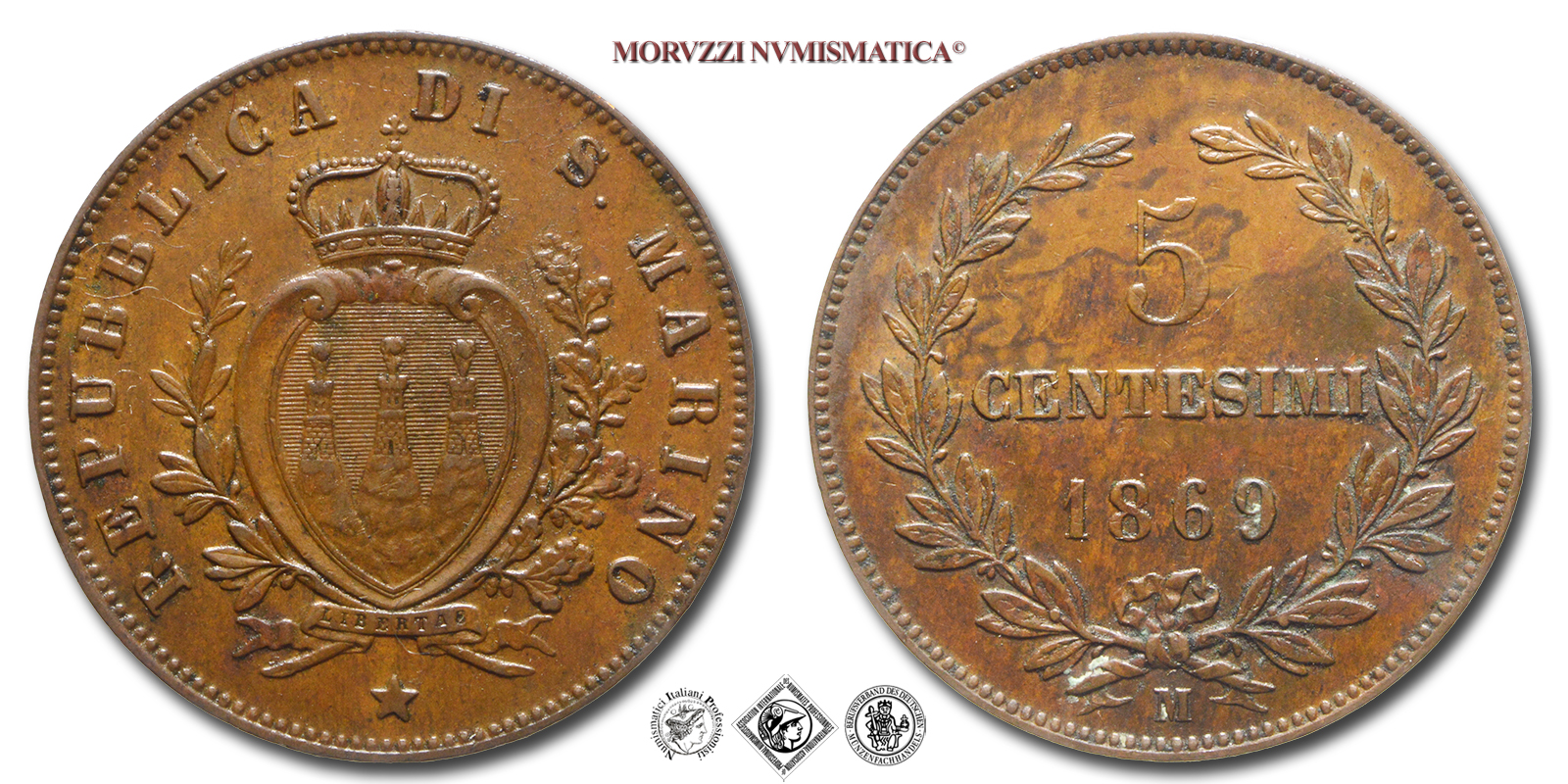 Repubblica di San Marino, VECCHIA MONETAZIONE, 1864-1906, 5 CENTESIMI, Emissione: 1869, D/ Valore (5 CENTESIMI) e millesimo (1869) su tre righe contornato da due rami di alloro, in basso il segno di zecca (M), R/ Stemma araldico di San Marino con le tre torri attorniato da un ramo di ulivo (o lauro) e uno di quercia. In alto corona simbolo della sovranità di San Marino. In basso, cartiglio recante LIBERTAS in incuso e stelletta. Intorno REPUBBLICA DI S • MARINO, Zecca di Milano, Rif. bibl. Pagani, 378; Metallo: CU, gr. 5,01, (MZ153181), Diam.: mm. 24,99, qSPL