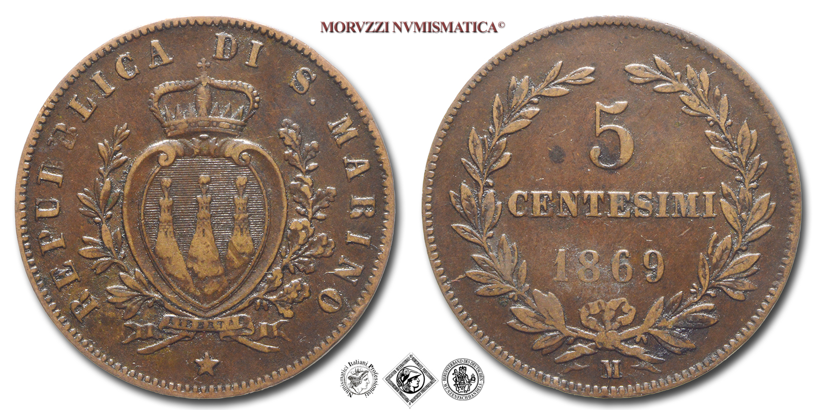Repubblica di San Marino, VECCHIA MONETAZIONE, 1864-1906, 5 CENTESIMI, Emissione: 1869, D/ Valore (5 CENTESIMI) e millesimo (1869) su tre righe contornato da due rami di alloro, in basso il segno di zecca (M), R/ Stemma araldico di San Marino con le tre torri attorniato da un ramo di ulivo (o lauro) e uno di quercia. In alto corona simbolo della sovranità di San Marino. In basso, cartiglio recante LIBERTAS in incuso e stelletta. Intorno REPUBBLICA DI S • MARINO, Zecca di Milano, Rif. bibl. Pagani, 378; Metallo: CU, gr. 4,83, (MZ153173), Diam.: mm. 25,02, BB