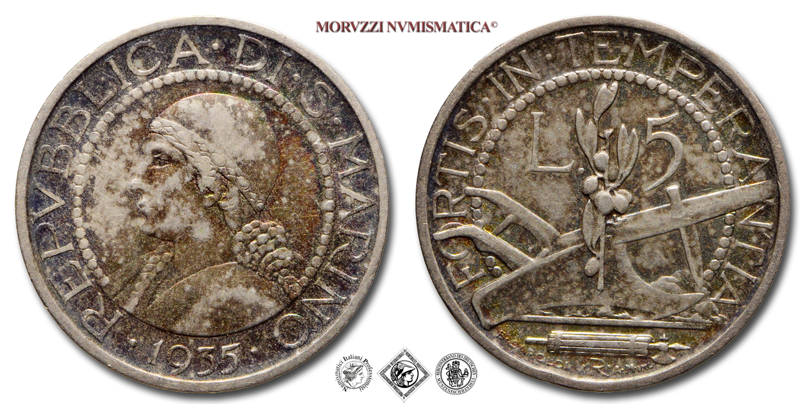 San Marino, REPUBBLICA, Vecchia Monetazione, 1864-1938, LIRE 5, Emissione: 1935, D/ all'interno di un cerchio di perline, busto di donna volto a sinistra. Intorno, REPVBBLICA • DI • S • MARINO e millesimo (1935) tra due •, R/ all'interno di un cerchio di perline, aratro sormontato da un ramo d'ulivo e indicazione del valore (L • 5). Intorno, FORTIS • IN • TEMPERANTIA. In esergo, fascio con scure posto in orizzontale al di sotto del quale si trova l'indicazione del segno di zecca (R) posto tra E • SAROLDI e A • M • INC •, Zecca di Roma, Rif. bibl. Pagani, 361; Metallo: AR, gr. 5,01, (MZ109668), Diam.: mm. 23,08, SPL