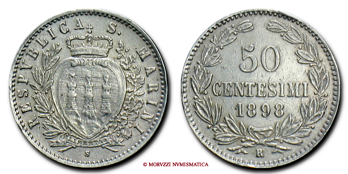 Repubblica di San Marino, VECCHIA MONETAZIONE, 1864-1938, CENTESIMI 50, Emissione: 1898, D/ Stemma araldico di San Marino con le tre torri attorniato da un ramo di ulivo (o lauro) e uno di quercia. In alto corona simbolo della sovranità di San Marino. In basso, cartiglio recante LIBERTAS in incuso. Intorno RESPVBLICA S • MARINI. In basso, indicazione dell'autore (S per Speranza), R/ Valore (50 CENTESIMI) e millesimo (1898) su tre righe contornato da due rami di alloro, in basso il segno di zecca (R), Zecca di Roma, Rif. bibl. Pagani, 369; Metallo: AR, gr. 2,48, (MZ115767), Diam.: mm. 18,15, qBB