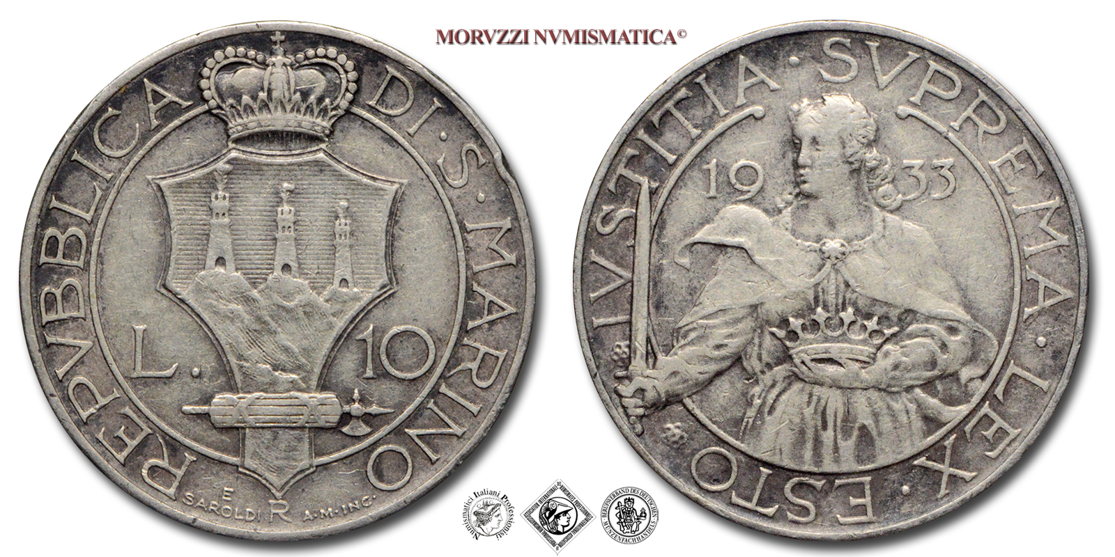 Repubblica di San Marino, VECCHIA MONETAZIONE, 1864-1938, LIRE 10, Emissione: 1933, D/ All'interno di un cerchio, stemma araldico di San Marino con le tre torri piumate e sormontato dalla corona della sovranità. Ai suoi lati indicazione del valore (L • 10) e, in basso, un fascio con scure in orizzontale. Intorno, REPVBBLICA DI • S • MARINO, in basso indicazione degli autori (E • SAROLDI A • M • INC.) e il segno di zecca (R), R/ All'interno di un cerchio (incompleto), busto di Sant'Agata vista di fronte con testa volta a sinistra mentre regge una spada con la destra e una corona con la sinistra, ai suoi lati le cifre del millesimo (1933). Intorno IVSTITIA • SVPREMA • LEX • ESTO preceduta e seguita da una rosetta a sei petali, Zecca di Roma, Rif. bibl. Pagani, 352; Metallo: AR, gr. 10,02, (MZ155616), Diam.: mm. 27,10, qSPL