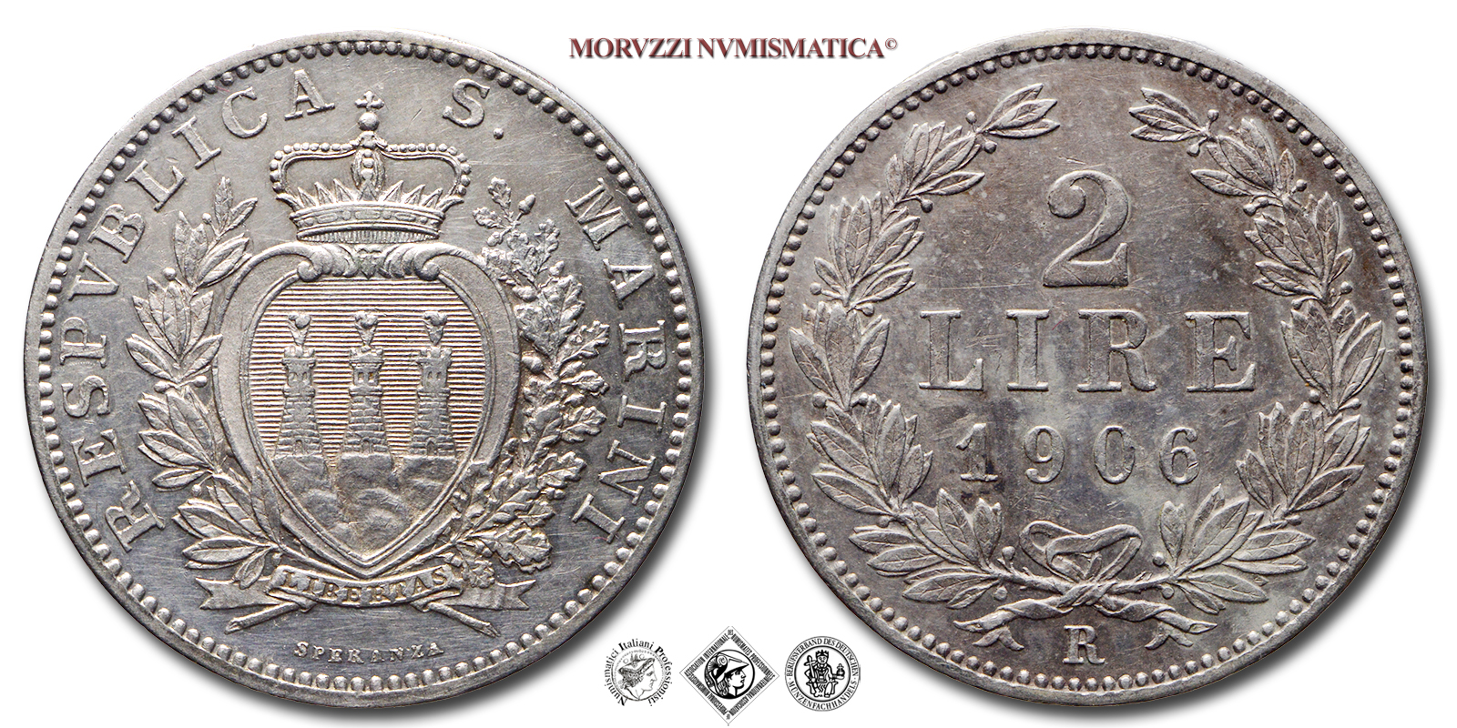 Repubblica di San Marino, VECCHIA MONETAZIONE, 1864-1938, LIRE 2, Emissione: 1906, D/ Stemma araldico di San Marino con le tre torri attorniato da un ramo di ulivo (o lauro) e uno di quercia. In alto corona simbolo della sovranità di San Marino. In basso, cartiglio recante LIBERTAS in incuso. Intorno RESPVBLICA S • MARINI. In basso, indicazione dell'autore (SPERANZA), R/ Valore (2 LIRE) e millesimo (1906) su tre righe contornato da due rami di alloro, in basso il segno di zecca (R), Zecca di Roma, Rif. bibl. Pagani, 366; Metallo: AR, gr. 10,04, (MZ156779), Diam.: mm. 27,12, qSPL, (R)
